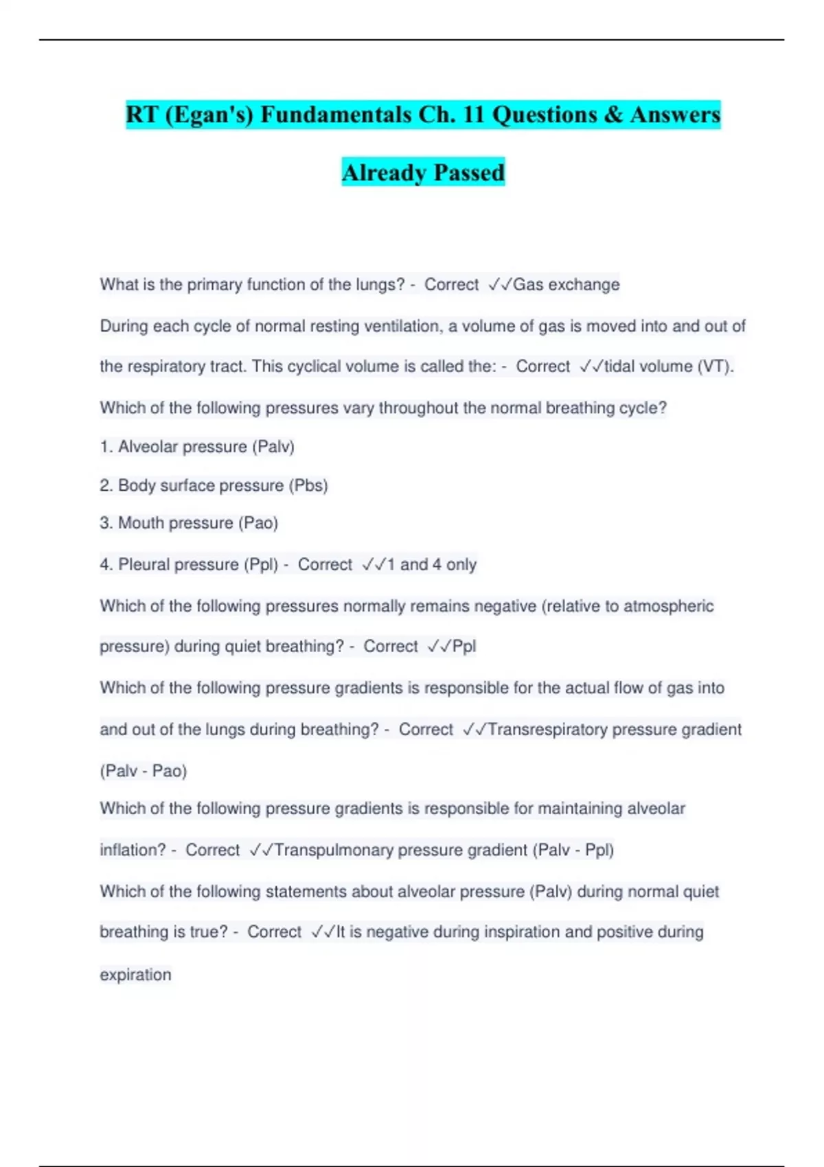 RT (Egan's) Fundamentals Ch. 11 Questions & Answers Already Passed