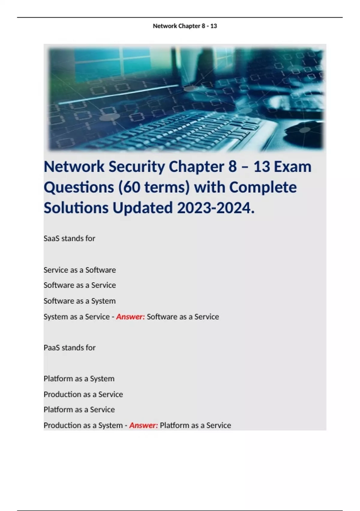 Network Security Chapter 8 – 13 Exam Questions (60 terms) with Complete Solutions Updated . Terms like: SaaS stands for Service as a Software Software as a Service Software as a System System as a Service - Answer: Software as a Service
