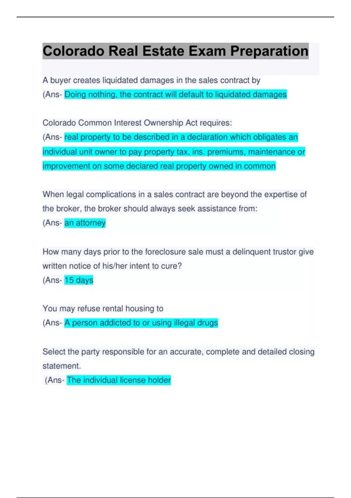 A buyer creates liquidated damages in the sales contract by (Ans- Doing nothing, the contract will default to liquidated damages Colorado Common Interest Ownership Act requires: (Ans- real property to be described in a declaration which obligates an individual unit owner to pay property tax, ins. premiums, maintenance or improvement on some declared real property owned in common When legal complications in a sales contract are beyond the expertise of the broker, the broker should always seek assistance from: (Ans- an attorney How many days prior to the foreclosure sale must a delinquent trustor give written notice of his/her intent to cure? (Ans- 15 days You may refuse rental housing to (Ans- A person addicted to or using illegal drugs Select the party responsible for an accurate, complete and detailed closing statement. (Ans- The individual license holder Rule F allows for all of the following, EXCEPT: (Ans- An addendum to be included within the body of a Commission-approved form A broker who intends to mark-up or add fees for services performed on behalf of a client by any third party or affiliated business entity is NOT required to: (Ans- Use the appropriate form to notify the Real Estate Commission A "Licensee Buy-Out Addendum" signed by the listing brokerage firm's supervising broker (Ans- binds the firm and buyer broker to the buy-out addendum Unlicensed personal assistant may do all of the following EXCEPT (Ans- Explain the reasons behind the pricing of a property. A broker is listing a property that has a well. What specific action does the seller have to take to make sure that the well is transferred? Seller must provide the Source of Water Disclosure form to the buyer (Ans- Seller must provide the Source of Water Disclosure form to the buyer Closing statements must be received (Ans- At closing. The title commitment lists a number of standard exceptions, if the buyer obtains an owner's coverage policy this means the standard exceptions (Ans- should be verified as remove