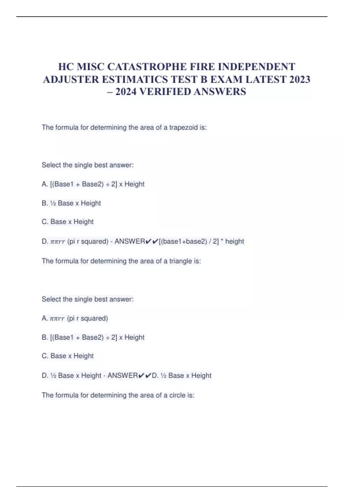 HC MISC CATASTROPHE FIRE INDEPENDENT ADJUSTER ESTIMATICS TEST B EXAM LATEST 2023
