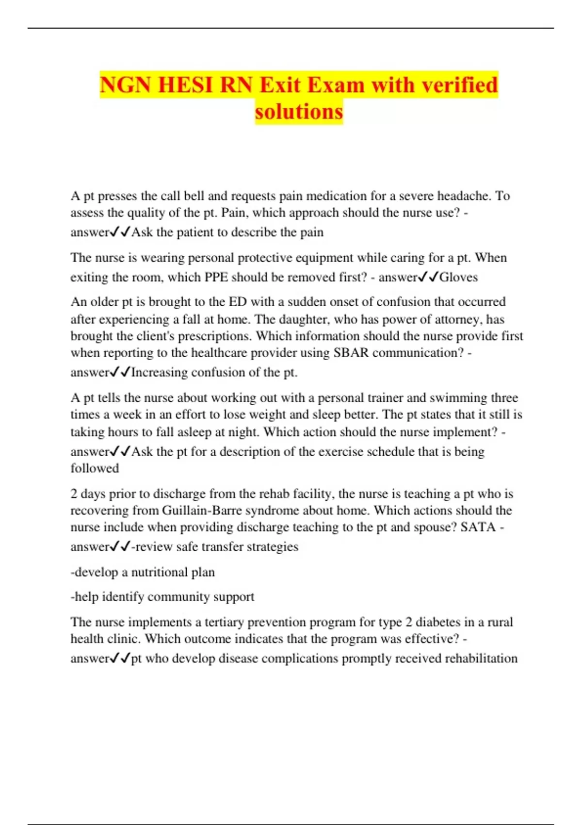 NGN HESI RN Exit Exam with verified solutions A pt presses the call bell and requests pain medication for a severe headache. To assess the quality of the pt. Pain, which approach should the nurse use? - answerAsk the patient to describe the pain The nurse is wearing personal protective equipment while caring for a pt. When exiting the room, which PPE should be removed first? - answerGloves An older pt is brought to the ED with a sudden onset of confusion that occurred after experiencing a fall at home. The daughter, who has power of attorney, has brought the client's prescriptions. Which information should the nurse provide first when reporting to the healthcare provider using SBAR communication? - answerIncreasing confusion of the pt. A pt tells the nurse about working out with a personal trainer and swimming three times a week in an effort to lose weight and sleep better. The pt states that it still is taking hours to fall asleep at night. Which action should the nurse implement? - answerAsk the pt for a description of the exercise schedule that is being followed 2 days prior to discharge from the rehab facility, the nurse is teaching a pt who is recovering from Guillain-Barre syndrome about home. Which actions should the nurse include when providing discharge teaching to the pt and spouse? SATA - answer-review safe transfer strategies -develop a nutritional plan -help identify community support The nurse implements a tertiary prevention program for type 2 diabetes in a rural health clinic. Which outcome indicates that the program was effective? - answerpt who develop disease complications promptly received rehabilitation