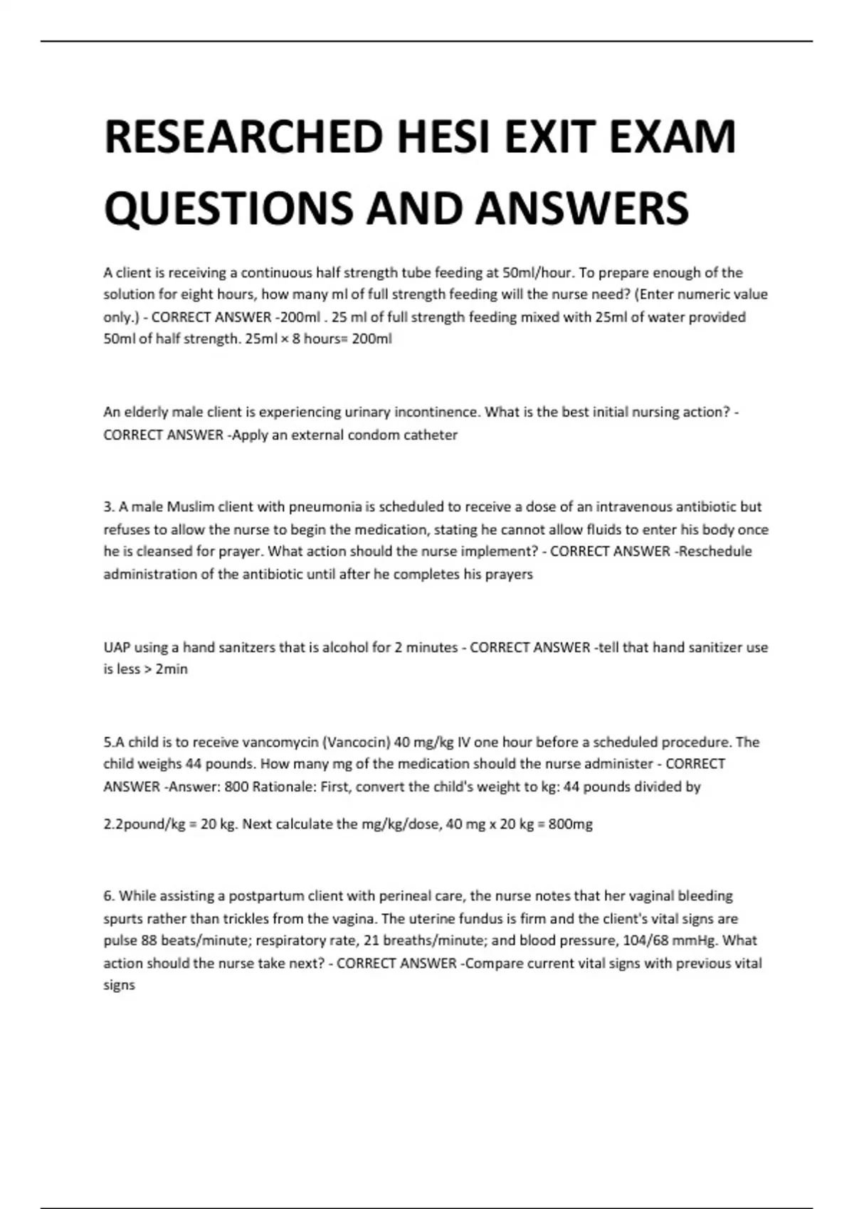 RESEARCHED HESI EXIT EXAM QUESTIONS AND ANSWERS A client is receiving a continuous half strength tube feeding at 50ml/hour. To prepare enough of the solution for eight hours, how many ml of full strength feeding will the nurse need? (Enter numeric value only.) - CORRECT ANSWER -200ml . 25 ml of full strength feeding mixed with 25ml of water provided 50ml of half strength. 25ml × 8 hours= 200ml An elderly male client is experiencing urinary incontinence. What is the best initial nursing action? - CORRECT ANSWER -Apply an external condom catheter 3. A male Muslim client with pneumonia is scheduled to receive a dose of an intravenous antibiotic but refuses to allow the nurse to begin the medication, stating he cannot allow fluids to enter his body once he is cleansed for prayer. What action should the nurse implement? - CORRECT ANSWER -Reschedule administration of the antibiotic until after he completes his prayers UAP using a hand sanitzers that is alcohol for 2 minutes - CORRECT ANSWER -tell that hand sanitizer use is less > 2min 5.A child is to receive vancomycin (Vancocin) 40 mg/kg IV one hour before a scheduled procedure. The child weighs 44 pounds. How many mg of the medication should the nurse administer - CORRECT ANSWER -Answer: 800 Rationale: First, convert the child's weight to kg: 44 pounds divided by 2.2pound/kg = 20 kg. Next calculate the mg/kg/dose, 40 mg x 20 kg = 800mg 6. While assisting a postpartum client with perineal care, the nurse notes that her vaginal bleeding spurts rather than trickles from the vagina. The uterine fundus is firm and the client's vital signs are pulse 88 beats/minute; respiratory rate, 21 breaths/minute; and blood pressure, 104/68 mmHg. What action should the nurse take next? - CORRECT ANSWER -Compare current vital signs with previous vital signs A 6-year old boy was hit with a bat while playing at school. He has a splinter of wood imbedded in his eye. Which action should the school nurse take? - CORRECT ANSWER -Have the parent take the child for emergency help Within four weeks of childbirth, a client is admitted to the hospital for disorganized speech bizarre behavior, and strange thoughts about her infant being possessed by demons. The nurse identifies a nursing diagnosis of "Altered thought processes, secondary to" what condition? - CORRECT ANSWER Postpartum psychosis The nurse identifies a priority diagnosis of, "Altered comfort related to menstrual cramps" for a 25-yearold female client. Which self-care activity should the nurse emphasize in the client's teaching plan? - CORRECT ANSWER -Regular aerobic exercise. Psych/Alcohol/Tylenol overdose antidote - CORRECT ANSWER -Give Mucomyst Medical Surgical/Laxative abuses - CORRECT ANSWER -Patient -taking Milk of Magnesium Spiritual/Documentation - CORRECT ANSWER -Native American - Allow pt's family to stay in the room Leadership- Interpreter informed consent - CORRECT ANSWER -Pt should sign the consent Geriatrics/Emergency Rib fractures fall - CORRECT ANSWER -Pulmonary embolism A client diagnosed with major depression is being allowed a weekend pass from the psychiatric unit. Which instruction should the nurse provide to the client's family? - CORRECT ANSWER -Involve the client in usual at home activities Upon assessment, the nurse discovers that a postpartum client has persistent red lochia.