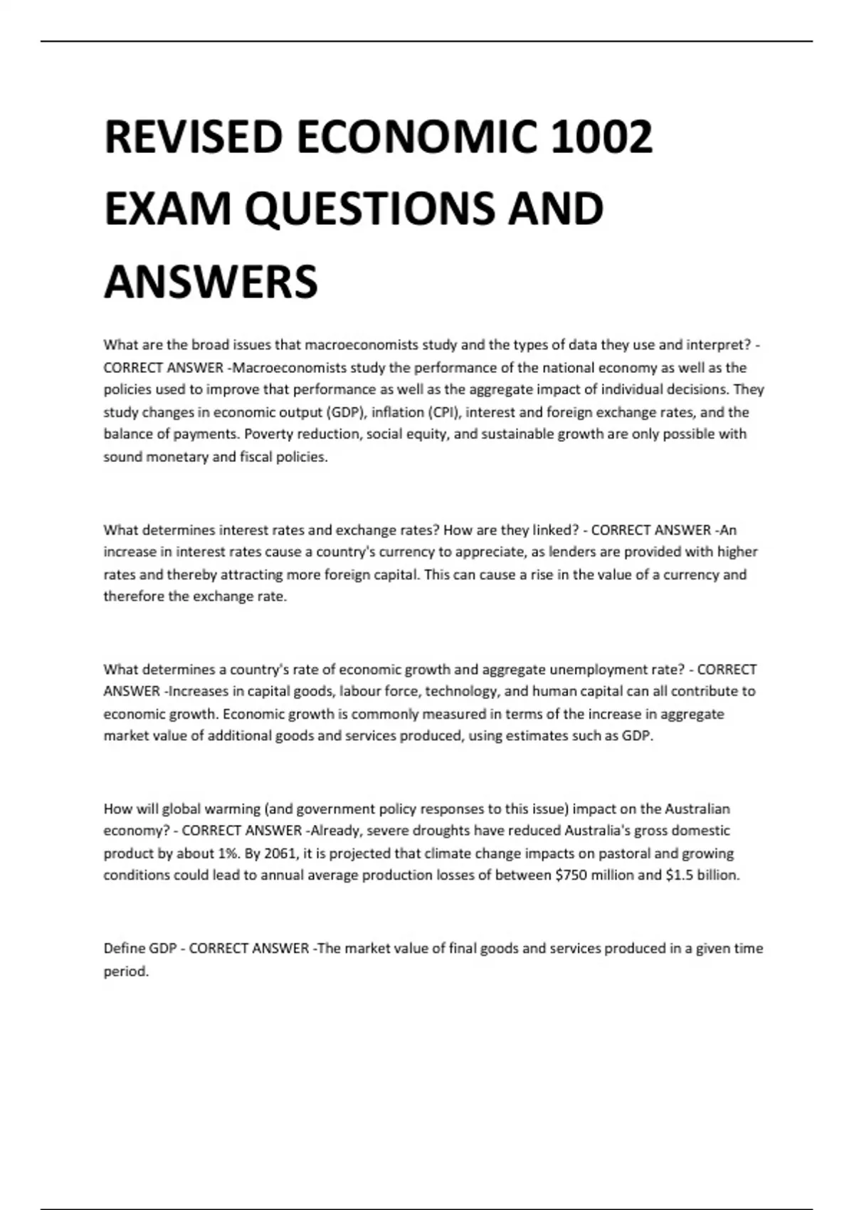 REVISED ECONOMIC 1002 EXAM QUESTIONS AND ANSWERS What are the broad issues that macroeconomists study and the types of data they use and interpret? - CORRECT ANSWER -Macroeconomists study the performance of the national economy as well as the policies used to improve that performance as well as the aggregate impact of individual decisions. They study changes in economic output (GDP), inflation (CPI), interest and foreign exchange rates, and the balance of payments. Poverty reduction, social equity, and sustainable growth are only possible with sound monetary and fiscal policies. What determines interest rates and exchange rates? How are they linked? - CORRECT ANSWER -An increase in interest rates cause a country's currency to appreciate, as lenders are provided with higher rates and thereby attracting more foreign capital. This can cause a rise in the value of a currency and therefore the exchange rate. What determines a country's rate of economic growth and aggregate unemployment rate? - CORRECT ANSWER -Increases in capital goods, labour force, technology, and human capital can all contribute to economic growth. Economic growth is commonly measured in terms of the increase in aggregate market value of additional goods and services produced, using estimates such as GDP. How will global warming (and government policy responses to this issue) impact on the Australian economy? - CORRECT ANSWER -Already, severe droughts have reduced Australia's gross domestic product by about 1%. By 2061, it is projected that climate change impacts on pastoral and growing conditions could lead to annual average production losses of between $750 million and $1.5 billion. Define GDP - CORRECT ANSWER -The market value of final goods and services produced in a given time period. WHat is the inflation rate - CORRECT ANSWER -The inflation rate is the rate at which prices in general are increasing over time. Unemployent rate - CORRECT ANSWER -The unemployment rate is the fraction of people who would like to be employed but can't find work. Unemployment rises during recessions, but there are always unemployed people even during good times. What causes slowdowns and speedups in the rate of productivity growth? - CORRECT ANSWER -Natural disasters, wars, and major economic disruptions such as financial crises and deep recessions tend to be accompanied by declines in labor productivity. Technological advances. Improved worker skills. Improved management practices. Economies of scale in production. Increases in the amount of non-labor inputs used. POSITIVE VERSUS NORMATIVE ANALYSES OF MACROECONOMIC POLICY - CORRECT ANSWER -A positive analysis addresses the policy's likely economic consequences but not whether those consequences are desirable. A normative analysis addresses the question of whether a proposed policy should be used. Debates about normative conclusions inevitably involve personal values and thus generally cannot be resolved by objective economic analysis alone. Real vs Nominal GDP - CORRECT ANSWER -Nominal GDP measures the final value of goods and services at current market prices. Real GDP measures the final value of goods and services using current quantities but the prices that prevailed in some past period. The advantage of using real GDP is that, unlike nominal GDP, it does not change if only the price of output has changed. Changes in real GDP occur only if the actual quantity of goods and services produced in the economy changes. IS it logical to correlate GDP and economic wellbeing - CORRECT ANSWER -For a variety of reasons, it is a mistake to equate a nation's real GDP with the welfare of its citizens. These reasons essentially relate to