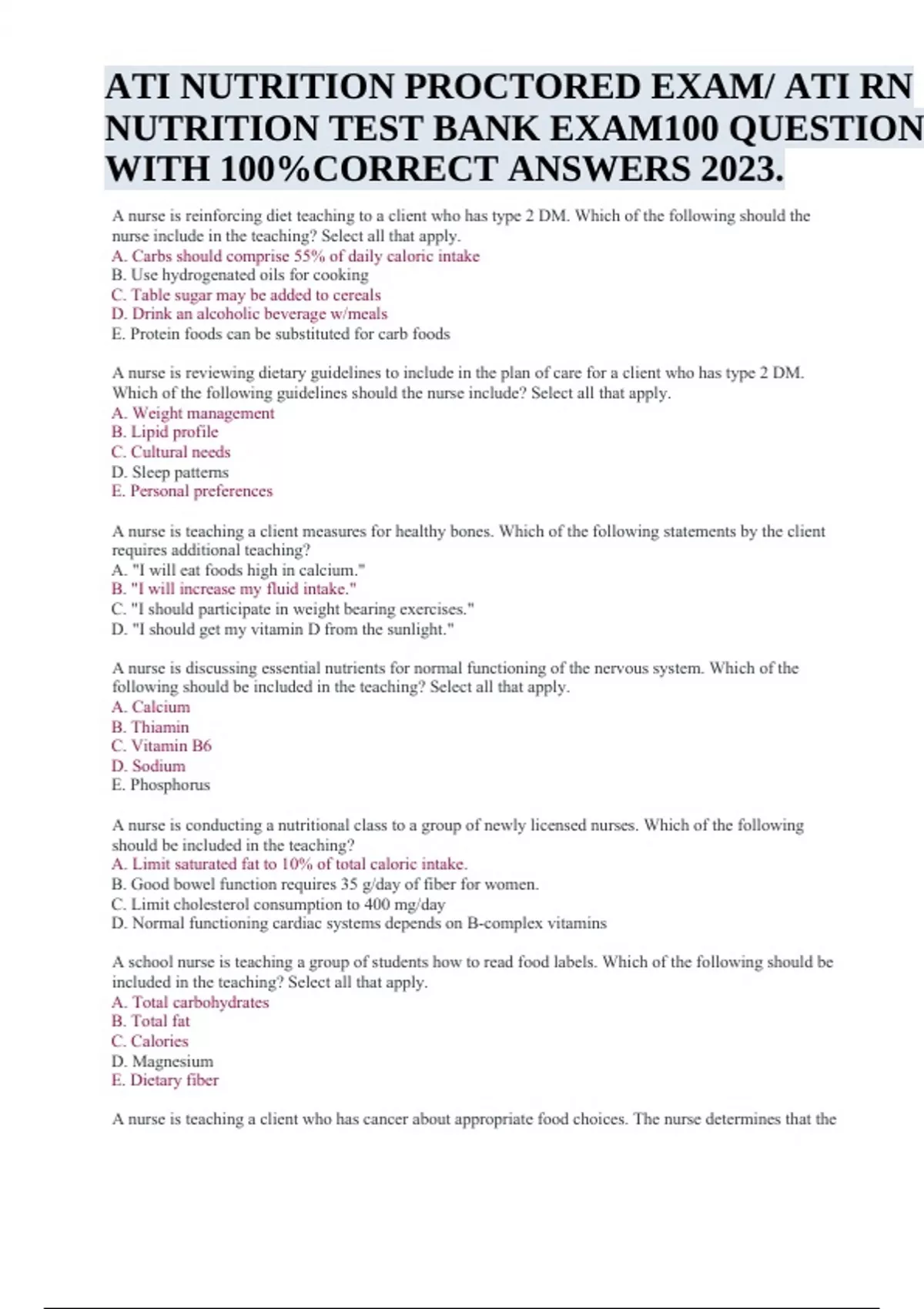 ATI Nutrition Proctored Exam 2023 Questions with 100% correct Answers///ATI Nutrition Proctored Exam 2023 Questions with 100% correct Answers
