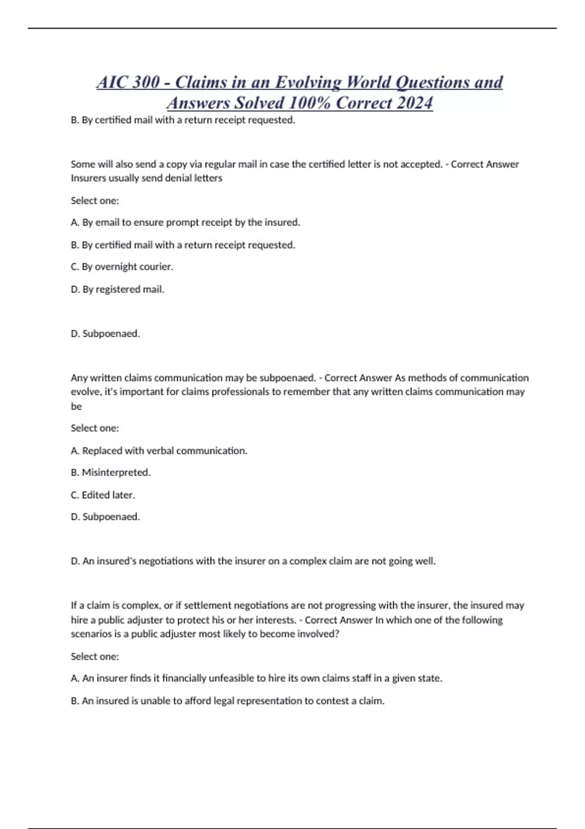 AIC 300 - Claims in an Evolving World Questions and Answers Solved 100% Correct 2024 B. By certified mail with a return receipt requested. Some will also send a copy via regular mail in case the certified letter is not accepted. - Correct Answer Insurers usually send denial letters Select one: A. By email to ensure prompt receipt by the insured. B. By certified mail with a return receipt requested. C. By overnight courier. D. By registered mail. D. Subpoenaed. Any written claims communication may be subpoenaed. - Correct Answer As methods of communication evolve, it's important for claims professionals to remember that any written claims communication may be Select one: A. Replaced with verbal communication. B. Misinterpreted. C. Edited later. D. Subpoenaed. D. An insured's negotiations with the insurer on a complex claim are not going well. If a claim is complex, or if settlement negotiations are not progressing with the insurer, the insured may hire a public adjuster to protect his or her interests. - Correct Answer In which one of the following scenarios is a public adjuster most likely to become involved? Select one: A. An insurer finds it financially unfeasible to hire its own claims staff in a given state. B. An insured is unable to afford legal representation to contest a claim. C. A catastrophic disaster strikes, involving damage to many properties.