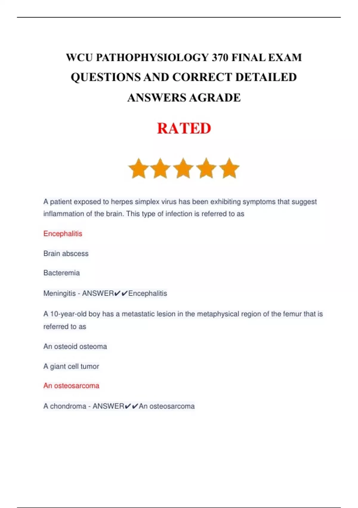 WCU PATHOPHYSIOLOGY 370 FINAL EXAM QUESTIONS AND CORRECT DETAILED ANSWERS AGRADE.