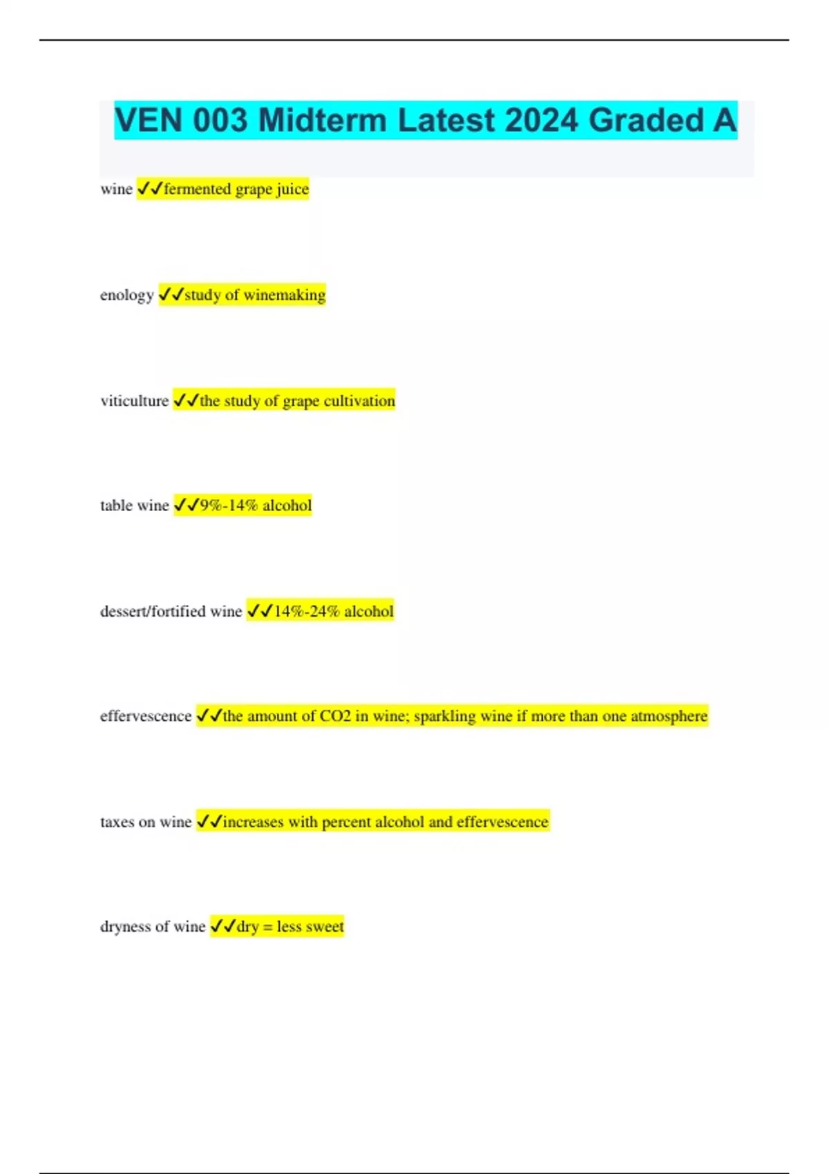 VEN 003 Midterm Latest 2024 Graded A wine fermented grape juice enology study of winemaking viticulture the study of grape cultivation table wine 9%-14% alcohol dessert/fortified wine 14%-24% alcohol effervescence the amount of CO2 in wine; sparkling wine if more than one atmosphere taxes on wine increases with percent alcohol and effervescence dryness of wine dry = less sweet must freshly crushed grapes including juice, seeds, and skins 63% of wine is produced in... Italy, France, Spain, USA, Argentina/Australia enotourism wine tourism, a growing industry saccharomyces cerevisiae yeast used to ferment wine, a fungus terrior the contribution of a location's distinctive physical features to the way food tastes; climate, soil, etc ampelography scientific description and classification of the grape vine flavor of wine comes from... grapes, fermentation, processing & aging grapes are good for fermentation because... high and sugar and nitrogen to provide nutrients to yeast, naturally have yeast on skin to protect against sun Vitis vinifera primary wine grape species, known as European wine grape locations/restrictions of grape growth between 30* and 50* N and S, temperate areas, can't grow in north US because of winter cold and can't grow in south US because of Pierce's disease Vitis riparia and Vitis rupestris used for rootstocks because partially immune to phylloxera phylloxera tiny root-eating louse that was transported to Europe from the US and devastated their grape vines, combated with sulfur powder and copper sprays budbreak the first stage in the life cycle of the grape vine, the first small shoots and leaves will break through buds left intact by winter pruning. verasion sudden acceleration towards maturation, most noticible by when grapes change color and soften; at this point sugar content begins to increase and acid concentration begins to fall tannins a class of astringent molecules that create flavor in wine, found in seeds and skins decision to harvest sugar content must be high enough, acidity can't be too low, varietal flavor optimal mechanical harvesting faster but damages berries and can cause early fermentation if grapes aren't processed quickly degree days cumulative measure of heat during the course of a year, creates 5 different growing regions in california what happens to grapes when temperature is too extreme... Hot: more sugar, higher yield, earlier ripining, but less color and flavor Too Hot: shriveled fruit, sunburn, sugar accumulation stops Cold: more color and flabor, but less sugar and more acid Too Cold: winter kill/spring frost, fruit won't