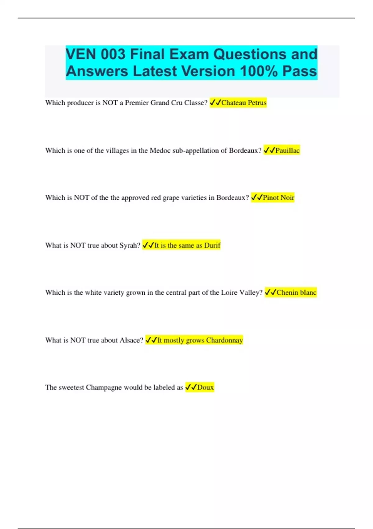 VEN 003 Final Exam Questions and Answers Latest Version 100% Pass Which producer is NOT a Premier Grand Cru Classe? Chateau Petrus Which is one of the villages in the Medoc sub-appellation of Bordeaux? Pauillac Which is NOT of the the approved red grape varieties in Bordeaux? Pinot Noir What is NOT true about Syrah? It is the same as Durif Which is the white variety grown in the central part of the Loire Valley? Chenin blanc What is NOT true about Alsace? It mostly grows Chardonnay The sweetest Champagne would be labeled as Doux A wine from the Rhone Valley that was labeled as Cabernet Sauvignon would use what geographic indication? IGP A solera is a blending system Angelo Gaja's first Cabernet Sauvignon was labeled as Vino de Tavola (Table Wine) A grape variety from southern Italy that is of interest because of global warming is Nero d'Avola Barbera is the red grape used in which Italian DOC? d'Asti What is NOT true about DOCG Chianti Classico wine? it must use at least 5% white grapes A Spanish wine labeled as "Reserva" will have had how many months of aging prior to being sold? 36 Which Portuguese red variety are the French considering for addition to approved varieties in Bordeaux? Touriga Nacional Which area in Portugal produces Port wine? Douro Valley Which country (in addition to Portugal) was instrumental in developing Port wine? England Traditional Port producers use shallow fermentors (lagarers) in order to: enhance color extraction What is the most important difference between QbA and QmP wines? region where grapes were grown Which variety is the most widely planted in Germany? Riesling Which is NOT true about Madeira wines? They are a mixture of red and white grapes Which QmP level is the sweetest? Trockenbeerenauslese The two German wine regions that together produce about 50% of all German wine are: The Rheinhessen and the Rheinpfalz QbA wines