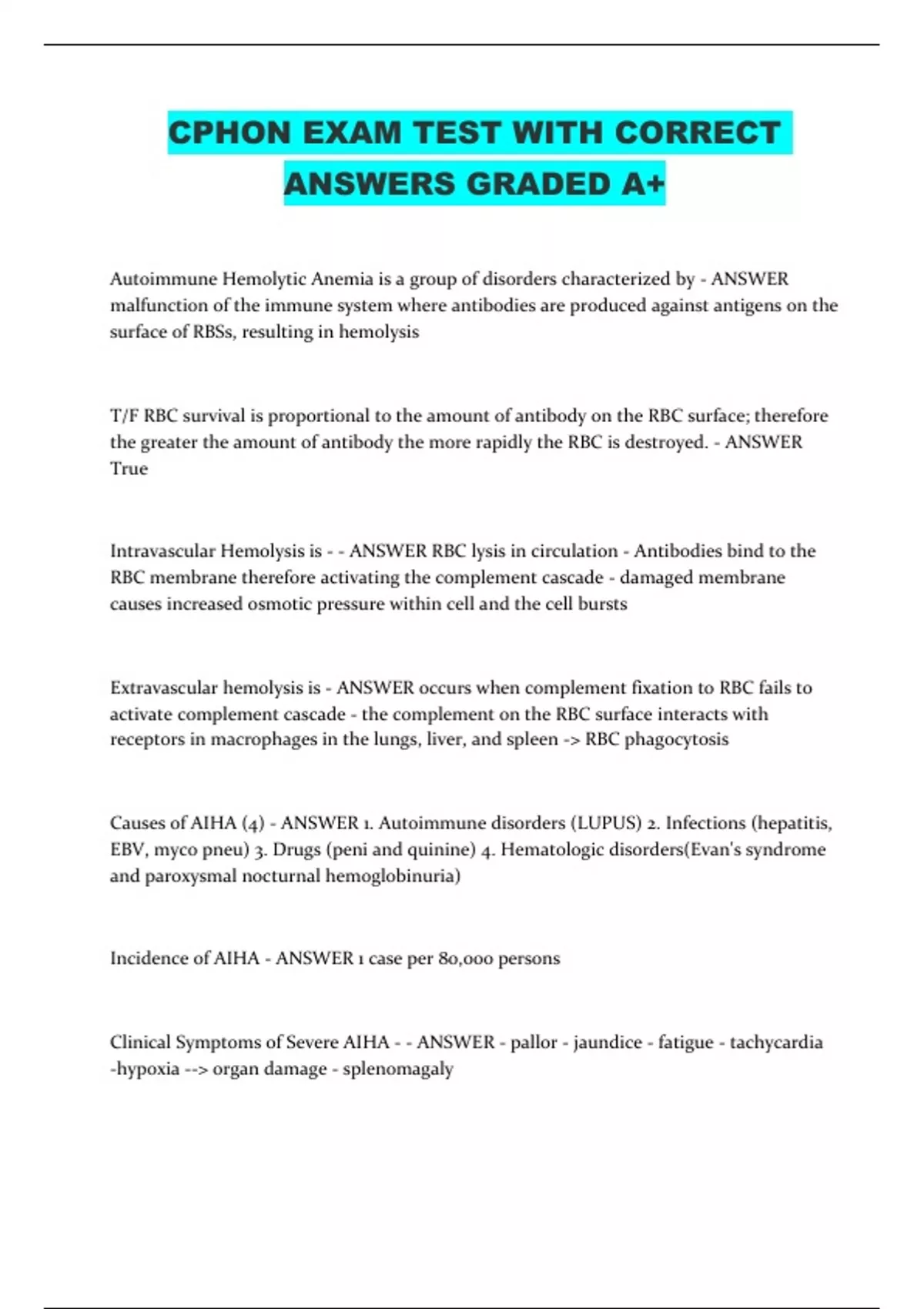 Autoimmune Hemolytic Anemia is a group of disorders characterized by - ANSWER malfunction of the immune system where antibodies are produced against antigens on the surface of RBSs, resulting in hemolysis T/F RBC survival is proportional to the amount of antibody on the RBC surface; therefore the greater the amount of antibody the more rapidly the RBC is destroyed. - ANSWER True Intravascular Hemolysis is - - ANSWER RBC lysis in circulation - Antibodies bind to the RBC membrane therefore activating the complement cascade - damaged membrane causes increased osmotic pressure within cell and the cell bursts Extravascular hemolysis is - ANSWER occurs when complement fixation to RBC fails to activate complement cascade - the complement on the RBC surface interacts with receptors in macrophages in the lungs, liver, and spleen - RBC phagocytosis Causes of AIHA (4) - ANSWER 1. Autoimmune disorders (LUPUS) 2. Infections (hepatitis, EBV, myco pneu) 3. Drugs (peni and quinine) 4. Hematologic disorders(Evan's syndrome and paroxysmal nocturnal hemoglobinuria) Incidence of AIHA - ANSWER 1 case per 80,000 persons Clinical Symptoms of Severe AIHA - - ANSWER - pallor - jaundice - fatigue - tachycardia -hypoxia -- organ damage - splenomagaly What labs should be ordered if AIHA is suspected? - ANSWER cbc d/p, retic, peripheral smear, Coombs test, bilirubin, LDH, and haptoglobin Labs findings that suggest AIHA is possible: - ANSWER 1. Coombs direct (DAT) : + which indicates antibodies against the RBC 2. Low Hemoglobin 3. Increased Retic 4. Spherocytes, schistocytes, or erythrocyte agglutination on blood smear 5. Increased LDH 6. Decreased haptoglobin 7. Hemoglobinuria 8. Increased Unconj bilirubin Possible parts of the Treatment Plan of AIHA - ANSWER 1. Stop medication if suspected as cause 2. Prednisone 2-4 mg/kg/day 3. High Dose IVIG 4.Splenectomy 5. pRBC transfusion 6. Folic Acid supplementation 7. Plasmapheresis (b/c IgM is confind to the intravascular space) 8. Cytotoxic agents 9. Immunosuppressive agents (Cyclosporine) 10. Hormonal therapy (danazol) What are the three types of cytoxic agents that can be used for AIHA? - ANSWER 1. Antimetabolites (6-mecaptupurine, azathioprine) 2. alkylating agents (cyclophosphamide) 3. Mitotic agents (vincristine, vinblastine) T/F Cold Antibody AIHA is most common AIHA, in whcih the autoantibodies become most active and attack RBCs usually at temperatures well below normal. . - ANSWER False. 75% of cases are warm body Pathophysiology of Warm Body AIHA IgG - ANSWER is the most common antibody attaches to RBC recognized by monocyt