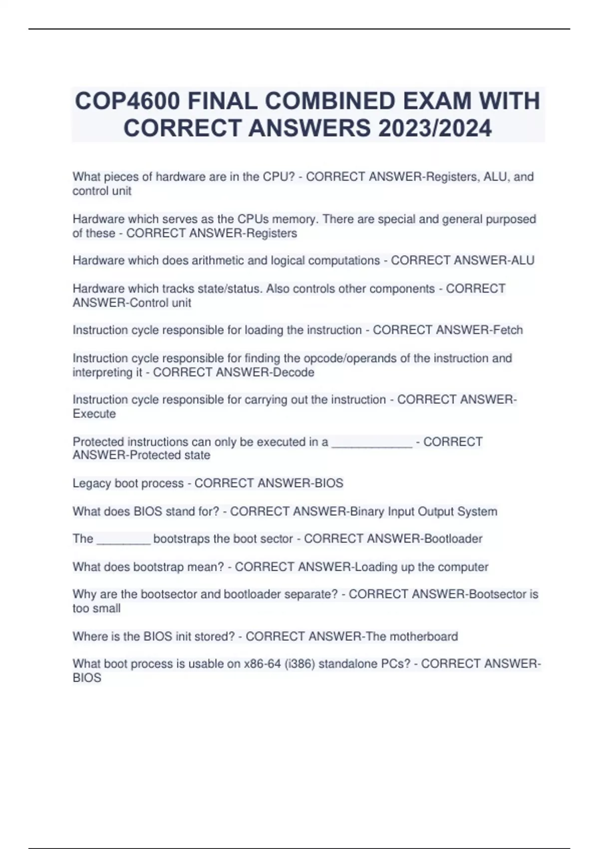 COP4600 FINAL COMBINED EXAM WITH CORRECT ANSWERS 2023/2024 What pieces of hardware are in the CPU? - CORRECT ANSWER-Registers, ALU, and control unit Hardware which serves as the CPUs memory. There are special and general purposed of these - CORRECT ANSWER-Registers Hardware which does arithmetic and logical computations - CORRECT ANSWER-ALU Hardware which tracks state/status. Also controls other components - CORRECT ANSWER-Control unit Instruction cycle responsible for loading the instruction - CORRECT ANSWER-Fetch Instruction cycle responsible for finding the opcode/operands of the instruction and interpreting it - CORRECT ANSWER-Decode Instruction cycle responsible for carrying out the instruction - CORRECT ANSWERExecute Protected instructions can only be executed in a ____________ - CORRECT ANSWER-Protected state Legacy boot process - CORRECT ANSWER-BIOS What does BIOS stand for? - CORRECT ANSWER-Binary Input Output System The ________ bootstraps the boot sector - CORRECT ANSWER-Bootloader What does bootstrap mean? - CORRECT ANSWER-Loading up the computer Why are the bootsector and bootloader separate? - CORRECT ANSWER-Bootsector is too small Where is the BIOS init stored? - CORRECT ANSWER-The motherboard What boot process is usable on x86-64 (i386) standalone PCs? - CORRECT ANSWERBIOS What boot process has standard for ARM chipset systems? - CORRECT ANSWERNeither Which boot process has standardized NVRAM locations for system variables? - CORRECT ANSWER-UEFI Which boot process uses a dedicated bootloader partition? - CORRECT ANSWERBIOS Which boot process is usable on x86-64 (x64) standalone PCs? - CORRECT ANSWER-Both Newer boot process - CORRECT ANSWER-UEFI Which boot process simplifies diskless systems? - CORRECT ANSWER-UEFI What are the functions of an OS? - CORRECT ANSWER-Loading programs onto machine, controlling I/O devices, managing resources (memory, CPU), multi-tasking execution, data protection (permissions), and task interaction (pipes, networking) Mode for directly manipulating hardware - CORRECT ANSWER-Kernel mode T/F: No device is directly accessed without the kernel - CORRECT ANSWER-True T/F: Only system libraries can invoke system calls - CORRECT ANSWER-False T/F: The system call invokes code written by system developers, while a procedure call invokes code written by an application programmer - CORRECT ANSWER-False A running program is in ______ - CORRECT ANSWER-Execution When we run a program, we create a _________ for it - CORRECT ANSWER-Process Features of a process - CORRECT ANSWER-Has some address space, associated with specific resources, computational element/object, and has one or more threads of execution When we make a _______, we add a stack frame to the call stack - CORRECT ANSWER-Procedure call Which pointer points to the beginning of the stack frame? - CORRECT ANSWER-Frame pointer Which pointer points to the beginning of the call stack? - CORRECT ANSWER-Stack pointer A ___________ involves a switch into kernel mode for execution - CORRECT ANSWER-System call Invocation of a system call causes a what? - CORRECT ANSWER-Kernel trap What must be stored in a kernel trap? - CORRECT ANSWER-Current address, registers, etc What gets the address from the interrupt vector during a kernel trap? - CORRECT ANSWER-OS dispatcher Generation of pre-OS in which there was a control room in which a human operator ran programs (plugboards) - CORRECT ANSWER-Generation 0: The operator When was Generation 0 of OS? - CORRECT ANSWER-1940s When was Generation 1 of OS? - CORRECT ANSWER-1950s Generation of OS in which a resident monitor was used to execute common tasks (basic job loading, config, etc) for the operator. Users would reserve time on the system. Precursor to modern concept of OS - CORRECT ANSWER-Generation 1: resident monitor Generation of OS in which job systems allowed many programs to be run in succession. A programmer would submit a job on punch cards. The punch cards would be read by a card reader onto magnetic tap. An operator would transfer prepared jobs to processing unit on input tape. Results would be written to output tape, which would be read and printed - CORRECT ANSWER-Generation 2: Batch systems Batch system in which the OS sets up the next job and removes the current. Programs are run sequentially - CORRECT ANSWER-Uniprogrammed batch systems Fence in memory which defines end in user memory and beginning of OS memory - CORRECT ANSWER-Fence register Issues with uniprogrammed batch systems - CORRECT ANSWER-Mainly I/O so idle CPU Batch system in which when one job was running, the OS would set up and began to run next. They would take turns on the CPU. In this system, the CPU was on idle when all jobs were in system - CORRECT ANSWER-Multiprogrammed batch systems Formula for CPU utilization - CORRECT ANSWER-1 - p^n (p = fraction of time process is in I/O wait; n = # jobs) When were batch systems prevalent? - CORRECT ANSWER-1950s/1960