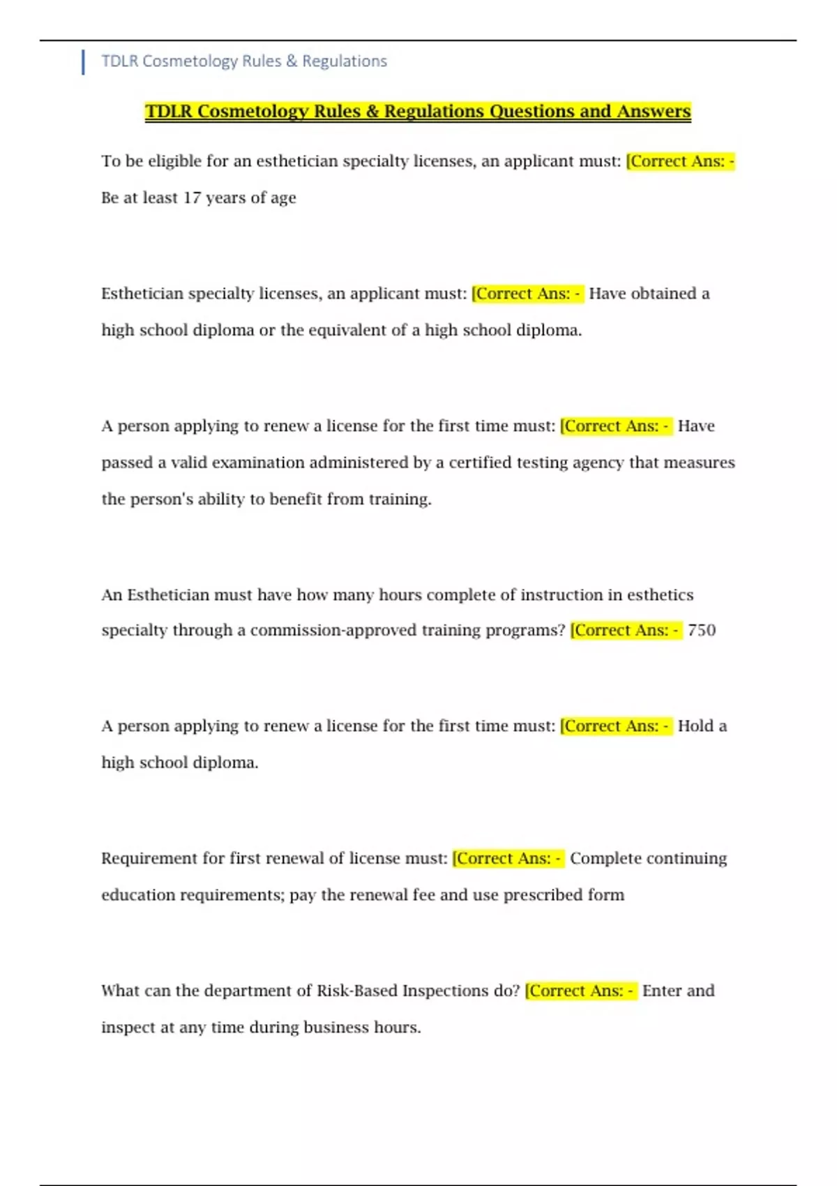 TDLR Cosmetology Rules & Regulations Questions and Answers