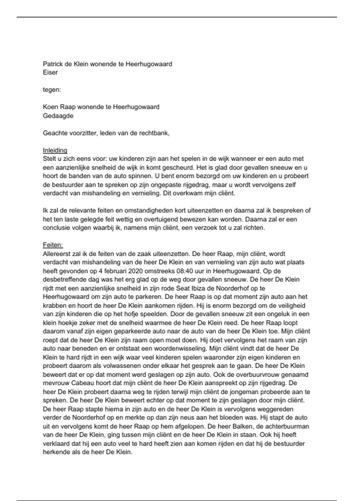 spreken. De heer De Klein beweert echter op dat moment te zijn geslagen door mijn cliënt.