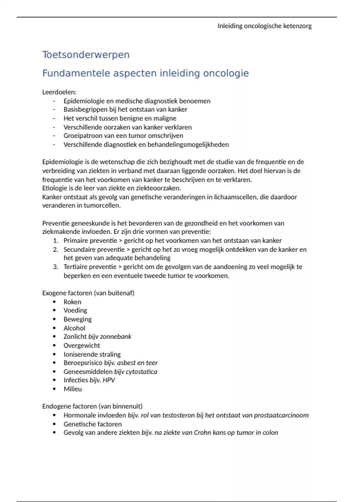 Samenvatting inleiding oncologische zorg