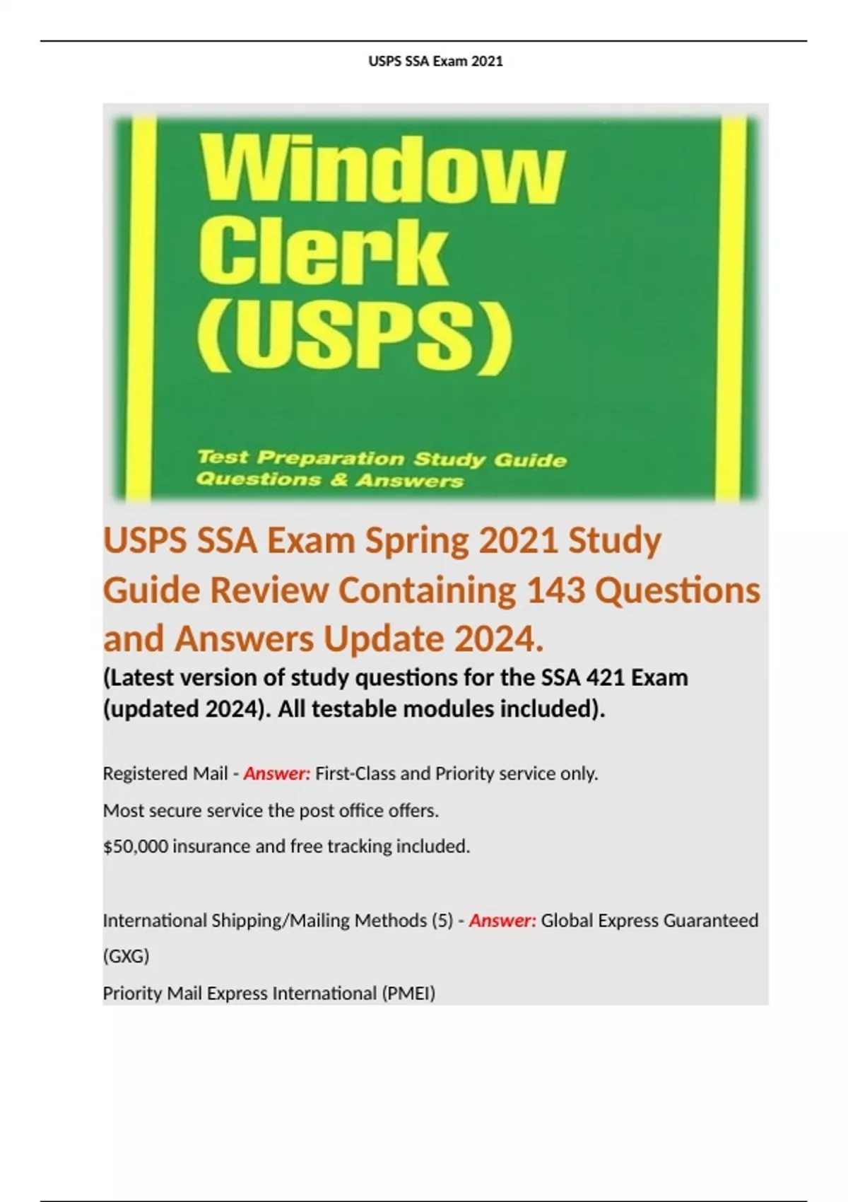 USPS SSA Exam Spring 2021 Study Guide Review Containing 143 Questions and Answers Update 2024. (Latest version of study questions for the SSA 421 Exam (updated 2024). All testable modules included).