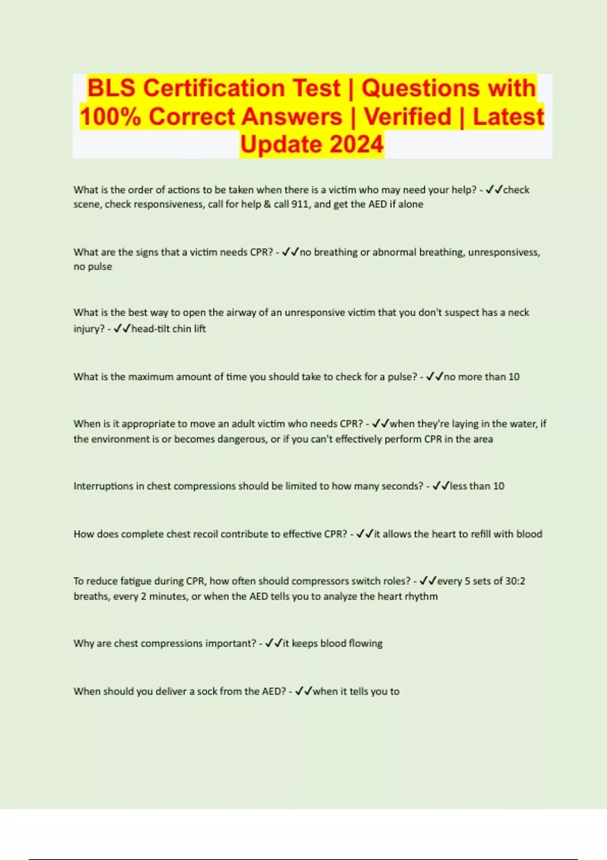 BLS Certification Test | Questions with 100% Correct Answers | Verified | Latest Update 2024
