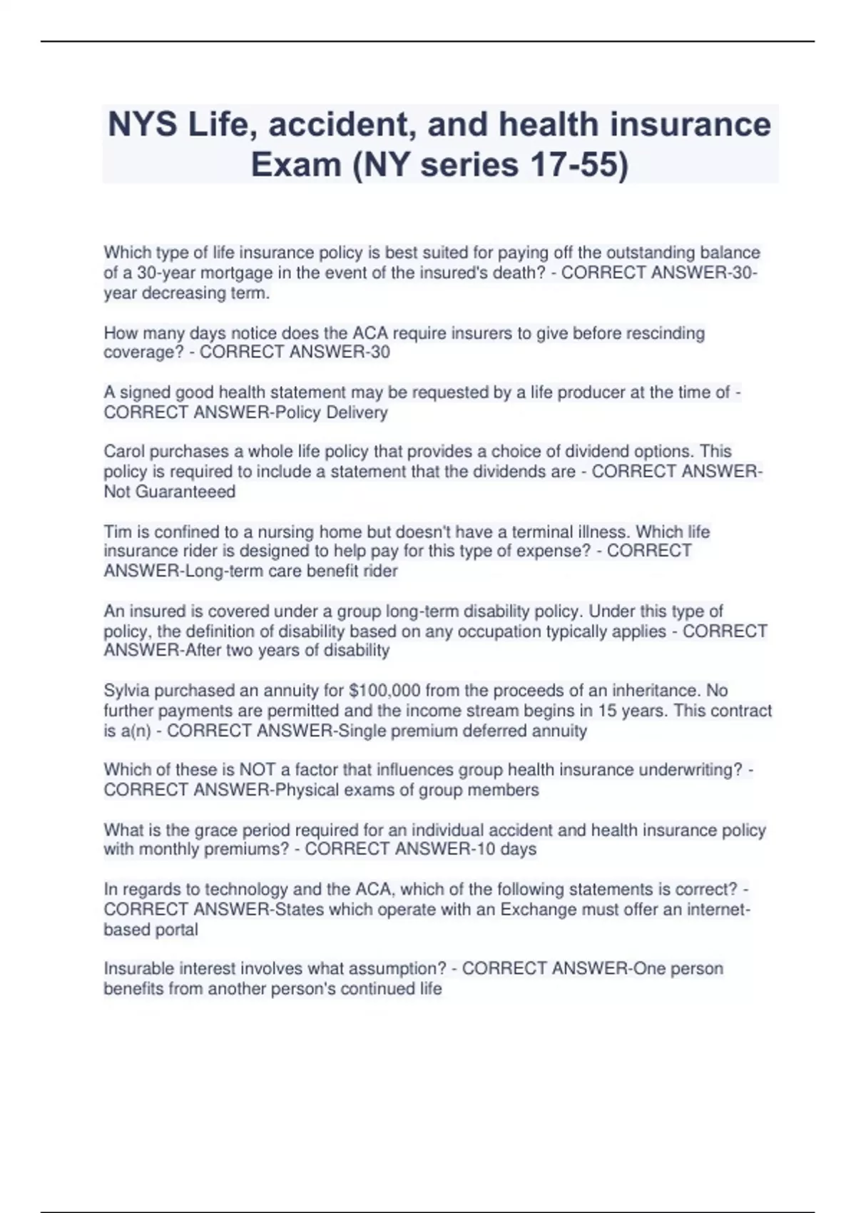 NYS Life, accident, and health insurance Exam (NY series 17-55) Which type of life insurance policy is best suited for paying off the outstanding balance of a 30-year mortgage in the event of the insured's death? - CORRECT ANSWER-30- year decreasing term. How many days notice does the ACA require insurers to give before rescinding coverage? - CORRECT ANSWER-30 A signed good health statement may be requested by a life producer at the time of - CORRECT ANSWER-Policy Delivery Carol purchases a whole life policy that provides a choice of dividend options. This policy is required to include a statement that the dividends are - CORRECT ANSWERNot Guaranteeed Tim is confined to a nursing home but doesn't have a terminal illness. Which life insurance rider is designed to help pay for this type of expense? - CORRECT ANSWER-Long-term care benefit rider An insured is covered under a group long-term disability policy. Under this type of policy, the definition of disability based on any occupation typically applies - CORRECT ANSWER-After two years of disability Sylvia purchased an annuity for $100,000 from the proceeds of an inheritance. No further payments are permitted and the income stream begins in 15 years. This contract is a(n) - CORRECT ANSWER-Single premium deferred annuity Which of these is NOT a factor that influences group health insurance underwriting? - CORRECT ANSWER-Physical exams of group members What is the grace period required for an individual accident and health insurance policy with monthly premiums? - CORRECT ANSWER-10 days In regards to technology and the ACA, which of the following statements is correct? - CORRECT ANSWER-States which operate with an Exchange must offer an internetbased portal Insurable interest involves what assumption? - CORRECT ANSWER-One person benefits from another person's continued life Which of these policies is considered a whole life policy? - CORRECT ANSWER-Single premium life Which of the following would be considered an unfair claims settlement practice? - CORRECT ANSWER-Misrepresenting pertinent policy provisions relating to coverage after a loss A policyowner is permitted to take out a policy loan on a whole life policy at what point? - CORRECT ANSWER-When the policy has a cash value Which of these is NOT a factor during the health insurance underwriting process? - CORRECT ANSWER-Former residence New York workers compensation laws exclude benefits for disabilities caused by - CORRECT ANSWER-Intentional, self-inflicted injuries occurring on the job When premiums are determined, one factor would be the expenses of the - CORRECT ANSWER-Insurer Scott has a life insurance policy in which the dividends are left with the insurance company. This particular policy may be paid up when the cash value plus accumulated dividends - CORRECT ANSWER-equal the net single premium for the same face amount at the insured's attained age During open enrollment for Medicare Supplement coverage, an applicant MUST be at least - CORRECT ANSWER-There is no minimum age requirement What happens to the cash value of a market value adjusted annuity if it's surrendered prior to the end of the stated guarantee period? - CORRECT ANSWER-Subject to market value adjustment Which of the following contracts offer deferred taxation, flexible payments, a guaranteed interest rate, and death benefits equal to the cash value? - CORRECT ANSWERFlexible premium fixed annuity Tonya has been diagnosed with kidney failure and has group accident and health insurance through her large employer. Which of these accident and health plans will be primary during the months following her diagnosis? - CORRECT ANSWER-Her employer's group accident and health plan Which statement regarding the certificate of insurance is accurate? - CORRECT ANSWER-It indicates evidence of an employee's insurance coverage According to the ACA, the proportion of premium revenues spent on clinical services and quality improvements is called the - CORRECT ANSWER-Medical loss ratio