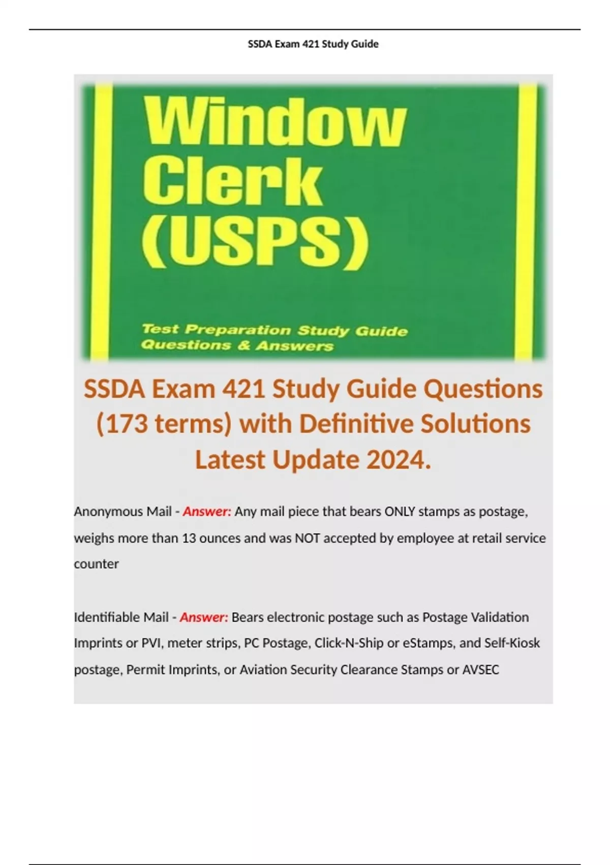 SSDA Exam 421 Study Guide Questions (173 terms) with Definitive Solutions Latest Update 2024. Terms like: Anonymous Mail - Answer: Any mail piece that bears ONLY stamps as postage, weighs more than 13 ounces and was NOT accepted by employee at retail service counter