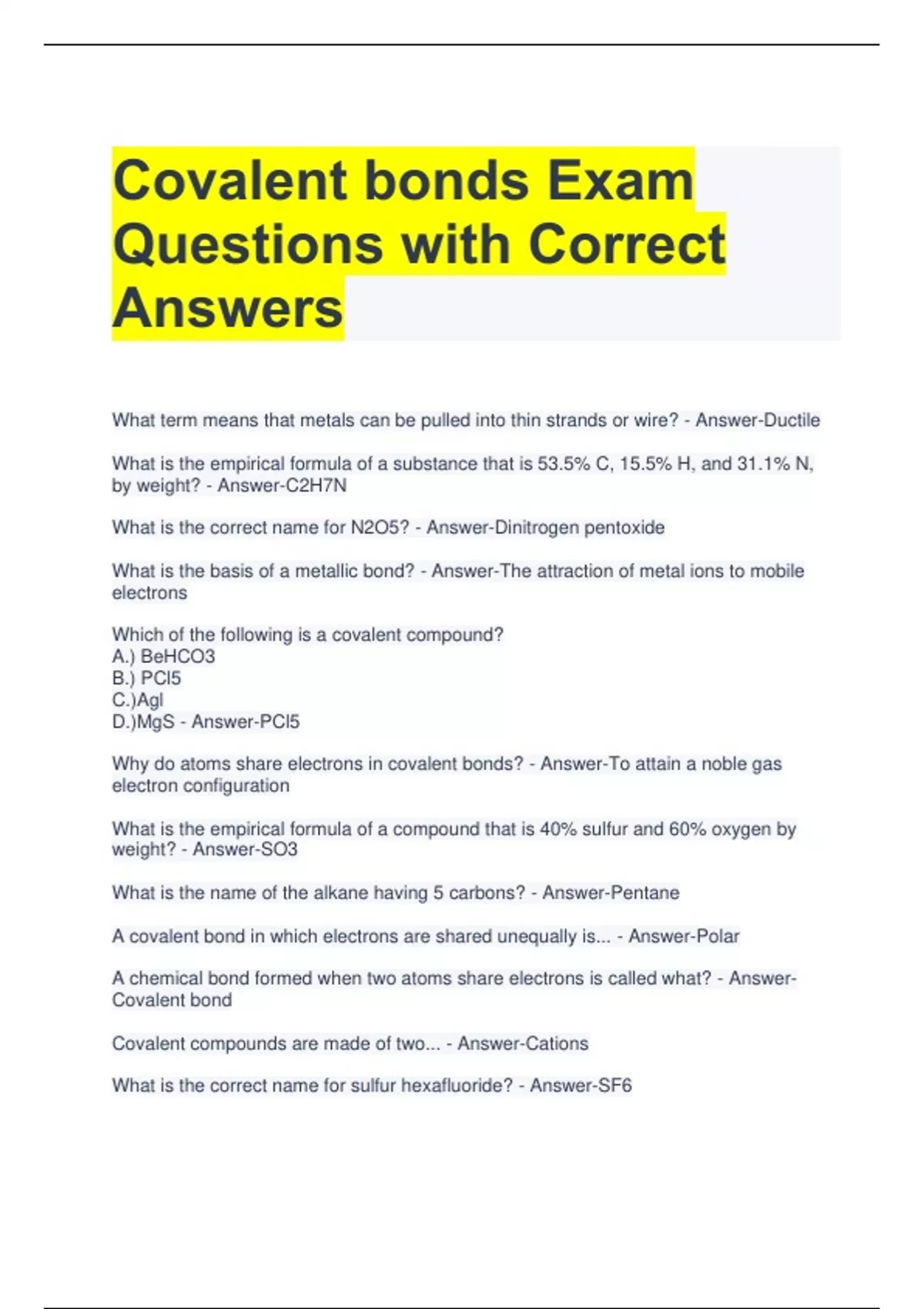 Covalent bonds Exam Questions with Correct Answers What term means that metals can be pulled into thin strands or wire? - Answer-Ductile What is the empirical formula of a substance that is 53.5% C, 15.5% H, and 31.1% N, by weight? - Answer-C2H7N What is the correct name for N2O5? - Answer-Dinitrogen pentoxide What is the basis of a metallic bond? - Answer-The attraction of metal ions to mobile electrons Which of the following is a covalent compound? A.) BeHCO3 B.) PCl5 C.)Agl D.)MgS - Answer-PCl5 Why do atoms share electrons in covalent bonds? - Answer-To attain a noble gas electron configuration What is the empirical formula of a compound that is 40% sulfur and 60% oxygen by weight? - Answer-SO3 What is the name of the alkane having 5 carbons? - Answer-Pentane