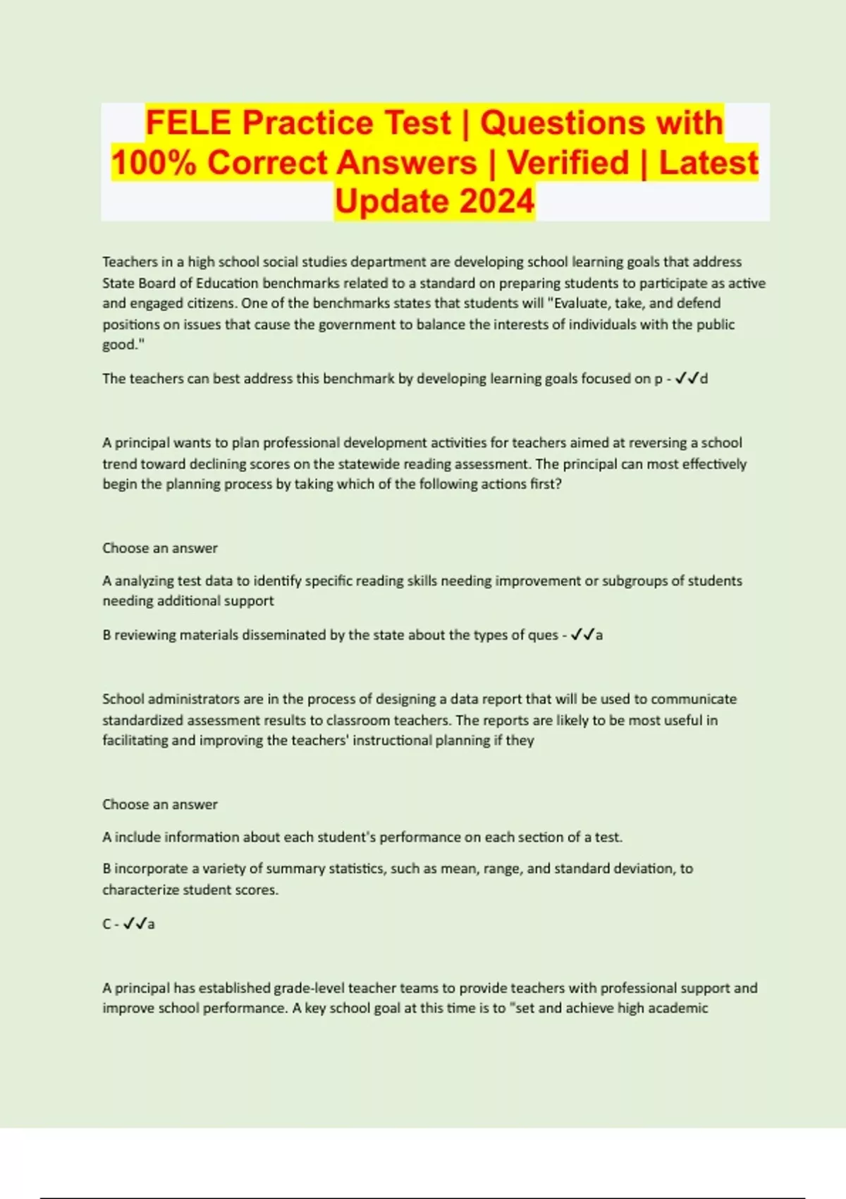 FELE Practice Test | Questions with 100% Correct Answers | Verified | Latest Update 2024