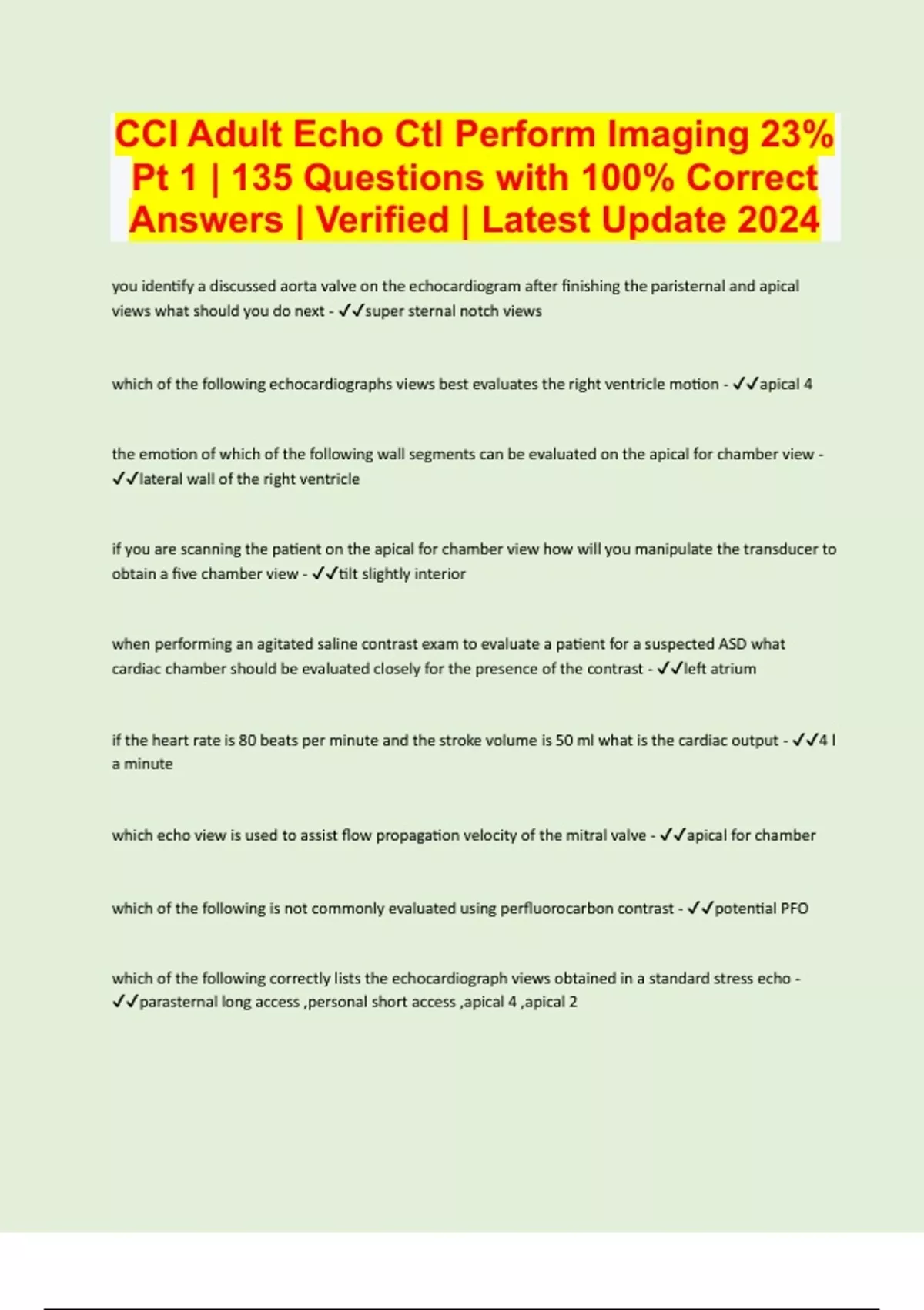 CCI Adult Echo Ctl Perform Imaging 23% Pt 1 | 135 Questions with 100% Correct Answers | Verified | Latest Update 2024
