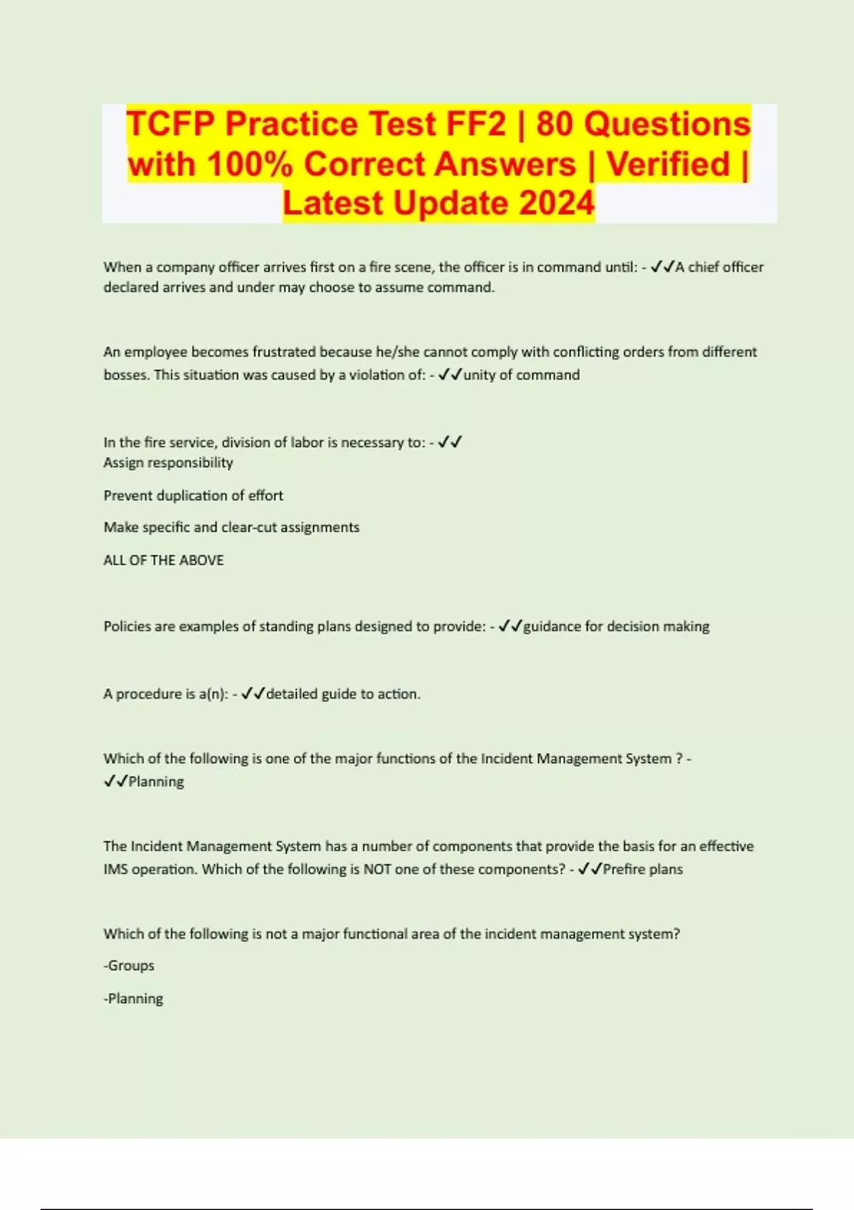 TCFP Practice Test FF2 | 80 Questions with 100% Correct Answers | Verified | Latest Update 2024