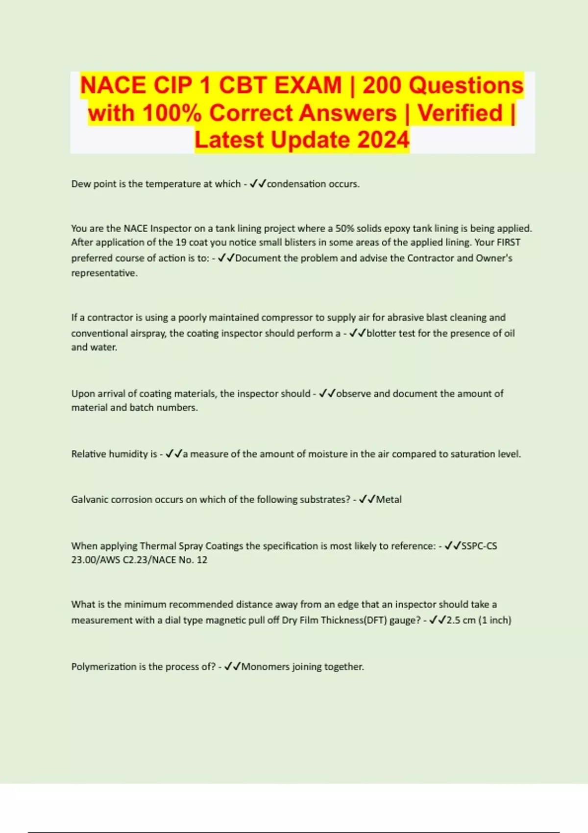 NACE CIP 1 CBT EXAM | 200 Questions with 100% Correct Answers | Verified | Latest Update 2024