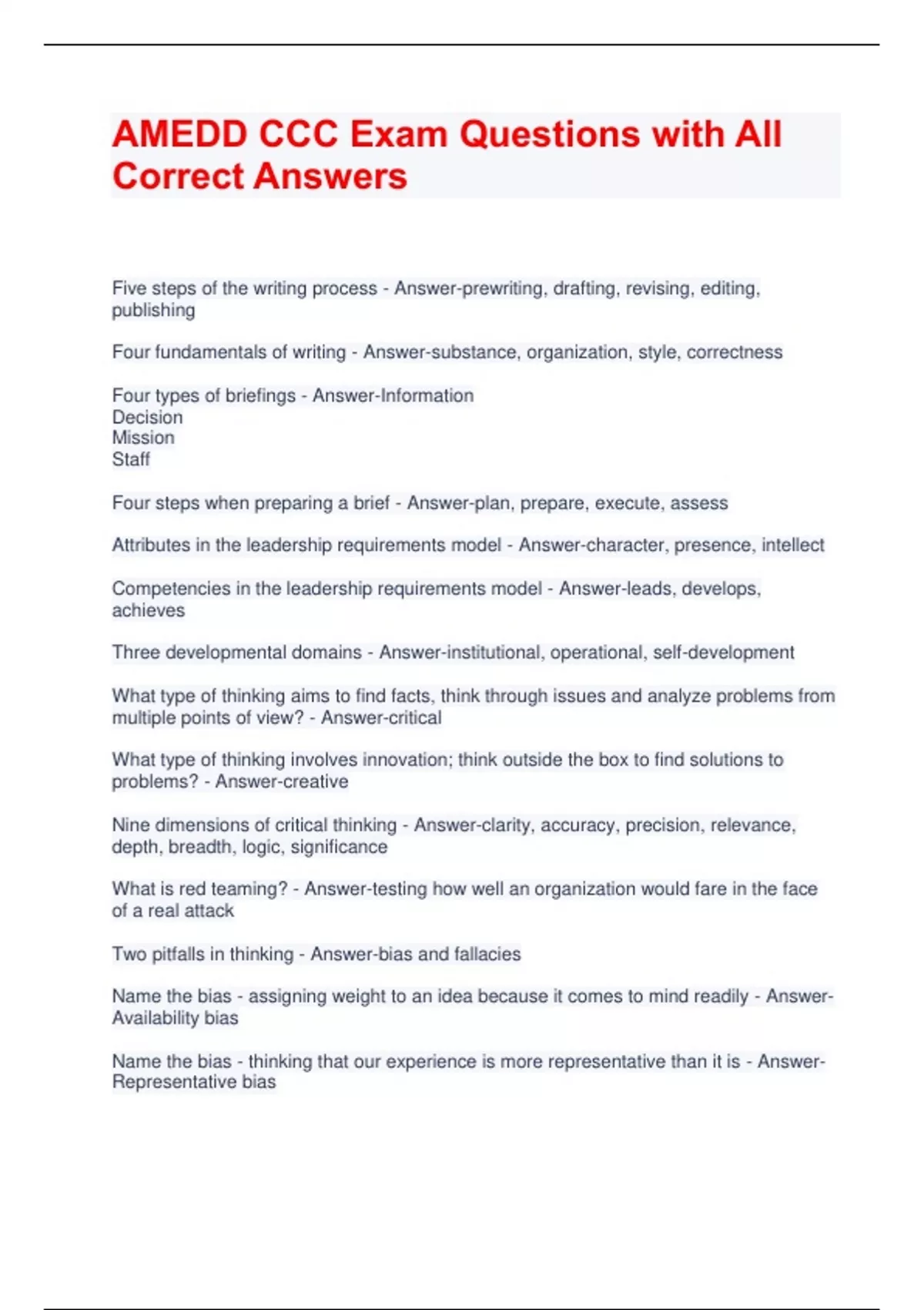 AMEDD CCC Exam Questions with All Correct Answers Five steps of the writing process - Answer-prewriting, drafting, revising, editing, publishing Four fundamentals of writing - Answer-substance, organization, style, correctness Four types of briefings - Answer-Information Decision Mission Staff Four steps when preparing a brief - Answer-plan, prepare, execute, assess Attributes in the leadership requirements model - Answer-character, presence, intellect Competencies in the leadership requirements model - Answer-leads, develops, achieves Three developmental domains - Answer-institutional, operational, self-development What type of thinking aims to find facts, think through issues and analyze problems from multiple points of view? - Answer-critical What type of thinking involves innovation; think outside the box to find solutions to problems? - Answer-creative Nine dimensions of critical thinking - Answer-clarity, accuracy, precision, relevance, depth, breadth, logic, significance What is red teaming? - Answer-testing how well an organization would fare in the face of a real attack Two pitfalls in thinking - Answer-bias and fallacies Name the bias - assigning weight to an idea because it comes to mind readily - AnswerAvailability bias Name the bias - thinking that our experience is more representative than it is - AnswerRepresentative bias Name the bias - unable to compute an item's true value, thus resorting to an overreliance on the initial "anchor" value provided by someone else - Answer-anchoring bias Name the fallacy - appeal to evidence irrelevant to the issue - Answer-fallacy of relevance Name the fallacy - leaving out material for a conclusion - Answer-fallacy of omission Name the fallacy - involving assumptions which may or may not be true - Answer-fallacy of assumption What's the difference between formal and informal leadership? - Answer-a. Formal Leadership: Granted by virtue of assignment to positions of responsibility, according to rank and experience b. Informal Leadership: not based on rank; stems from personal initiative, special knowledge, unique experiences, or technical expertise specific to an individual What's the difference between commitment and compliance? - Answer-a. Compliance: short-term; influence is based primarily on leader's authority b. Commitment: long-term; produces longer lasting and broader effects Name the method of influence - using explicit demands to achieve compliance - Answer-pressure Name the method of influence - leaders establish their authority as the basis for the request - Answer-legitimating Name the method of influence - providing incentive for gaining a higher level of compliance - Answer-exchange name the method of influence - when a leader asks for a subordinate's support based on personal or professional relationship - Answer-personal appeals name the method of influence - leader engage with subordinate or peers to apply influence by contributing to the outcome - Answer-collaboration name the method of influence - explanation showing how a request is relevant to the goal - Answer-rational persuasion name the method of influence - explaining why or how an order will benefit a subordinate - Answer-Apprising How do you extend influence outside of the CoC? - Answer-a. Build Trust outside lines of authority b. Understand Sphere, Means and Limits of Influence c. Negotiating , Building consensus and Resolving conflicts What's the difference between purpose, direction, and motivation? - Answer-a. Purpose: a reason for a task to be accomplished b. Direction: how a goal is to be achieved c. Motivation: the will and initiative to do what is necessary What's the difference between climate and culture? - Answer-Climate - shared perceptions of those in a work unit Culture - shared beliefs What are the three ethical lenses? - Answer-rules - the regs outcomes - the ends virtues - the means Type of responsibility - The obligation of a commander to ensure all Government property within his or her command is properly used and cared for - Answer-Command responsibility Type of responsibility - Obligation of a person to ensure all Government property for which he or she has receipted, is properly used and cared for - Answer-Direct responsibility