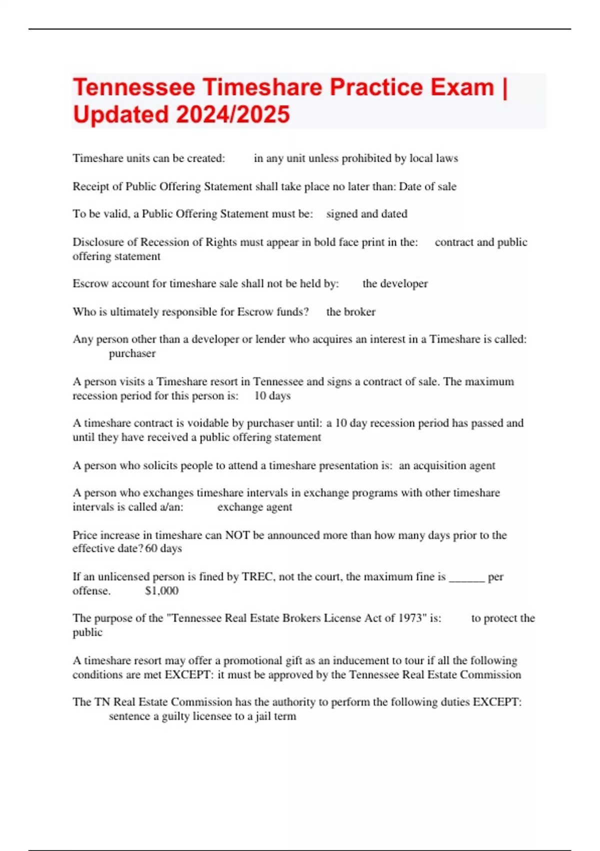 Tennessee Timeshare Practice Exam | Updated 2024/2025
