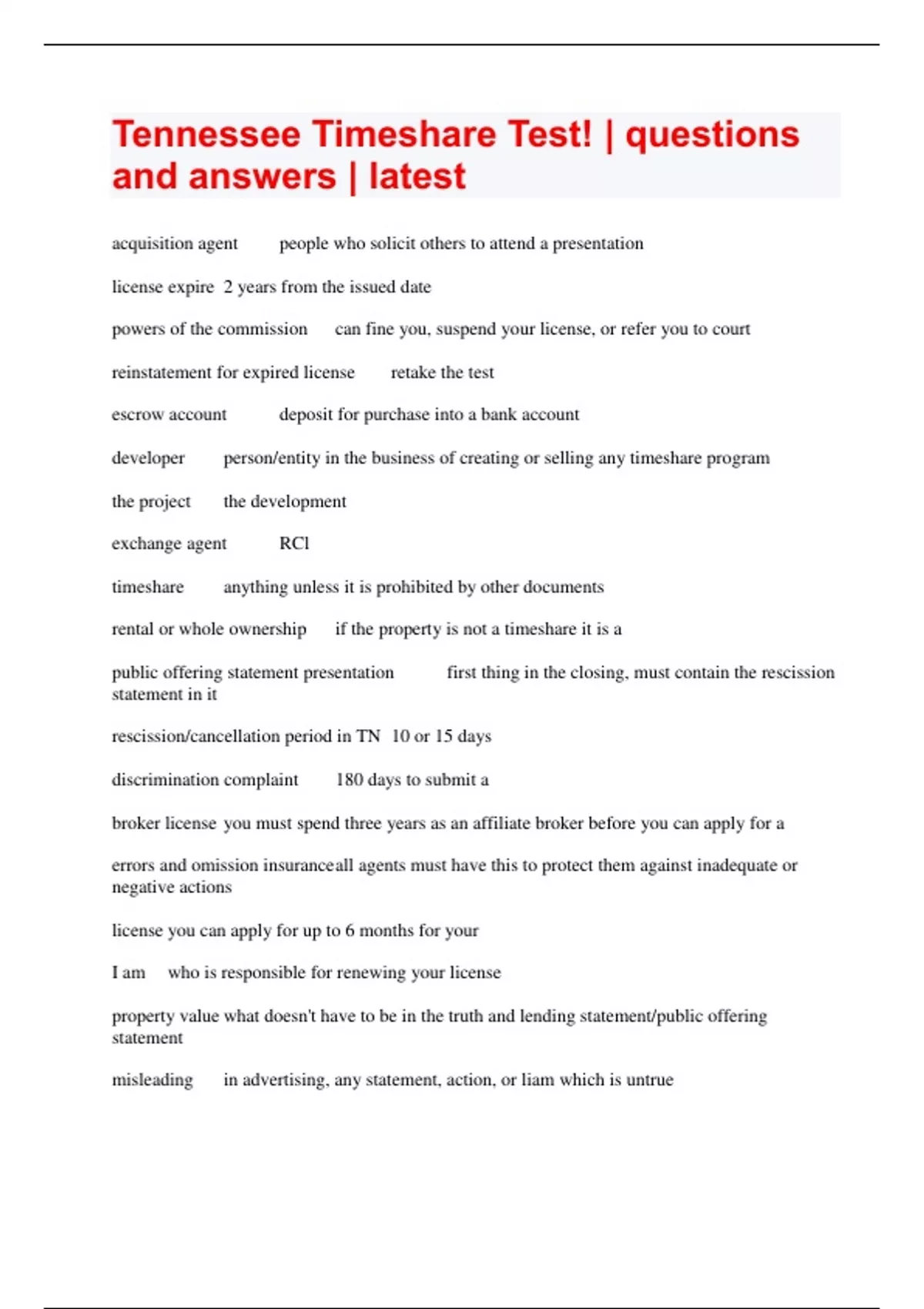 Tennessee Timeshare Test! | questions and answers | latest