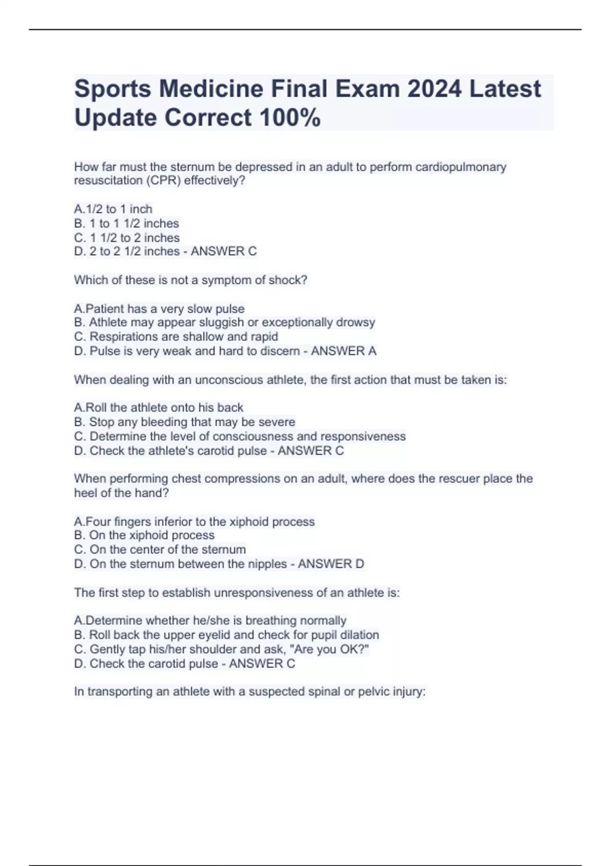 How far must the sternum be depressed in an adult to perform cardiopulmonary resuscitation (CPR) effectively? A.1/2 to 1 inch B. 1 to 1 1/2 inches C. 1 1/2 to 2 inches D. 2 to 2 1/2 inches - ANSWER C Which of these is not a symptom of shock? A.Patient has a very slow pulse B. Athlete may appear sluggish or exceptionally drowsy C. Respirations are shallow and rapid D. Pulse is very weak and hard to discern - ANSWER A When dealing with an unconscious athlete, the first action that must be taken is: A.Roll the athlete onto his back B. Stop any bleeding that may be severe C. Determine the level of consciousness and responsiveness D. Check the athlete's carotid pulse - ANSWER C When performing chest compressions on an adult, where does the rescuer place the heel of the hand? A.Four fingers inferior to the xiphoid process B. On the xiphoid process C. On the center of the sternum D. On the sternum between the nipples - ANSWER D The first step to establish unresponsiveness of an athlete is: A.Determine whether he/she is breathing normally B. Roll back the upper eyelid and check for pupil dilation C. Gently tap his/her shoulder and ask, "Are you OK?" D. Check the carotid pulse - ANSWER C