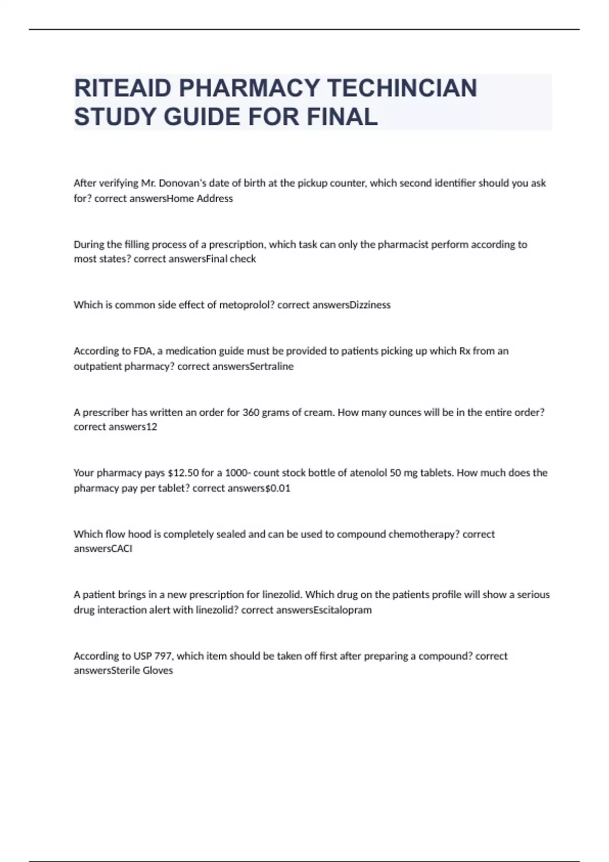 After verifying Mr. Donovan's date of birth at the pickup counter, which second identifier should you ask for? correct answersHome Address During the filling process of a prescription, which task can only the pharmacist perform according to most states? correct answersFinal check Which is common side effect of metoprolol? correct answersDizziness According to FDA, a medication guide must be provided to patients picking up which Rx from an outpatient pharmacy? correct answersSertraline A prescriber has written an order for 360 grams of cream. How many ounces will be in the entire order? correct answers12 Your pharmacy pays $12.50 for a 1000- count stock bottle of atenolol 50 mg tablets. How much does the pharmacy pay per tablet? correct answers$0.01 Which flow hood is completely sealed and can be used to compound chemotherapy? correct answersCACI A patient brings in a new prescription for linezolid. Which drug on the patients profile will show a serious drug interaction alert with linezolid? correct answersEscitalopram According to USP 797, which item should be taken off first after preparing a compound? correct answersSterile Gloves