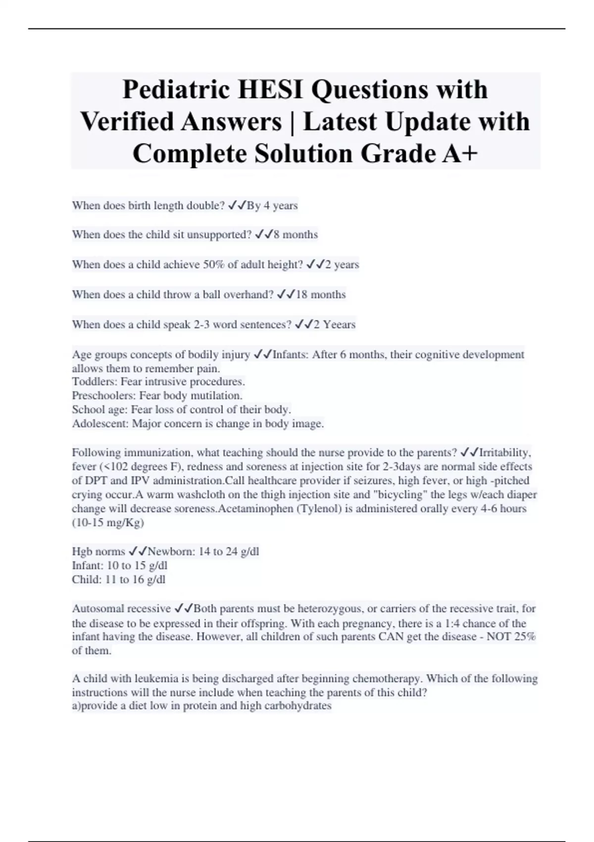 Pediatric HESI Final Exam Questions with Correct Answers| Latest Graded A+