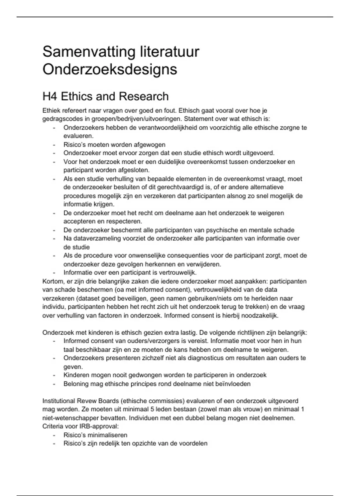 Samenvatting literatuur voor het vak Onderzoekspracticum (designs) bachelor Pedagogische Wetenschappen Rijksuniversiteit Groningen hoofdstuk: -4 -7 t/m 9 -13 t/m 18 -20 t/m 23