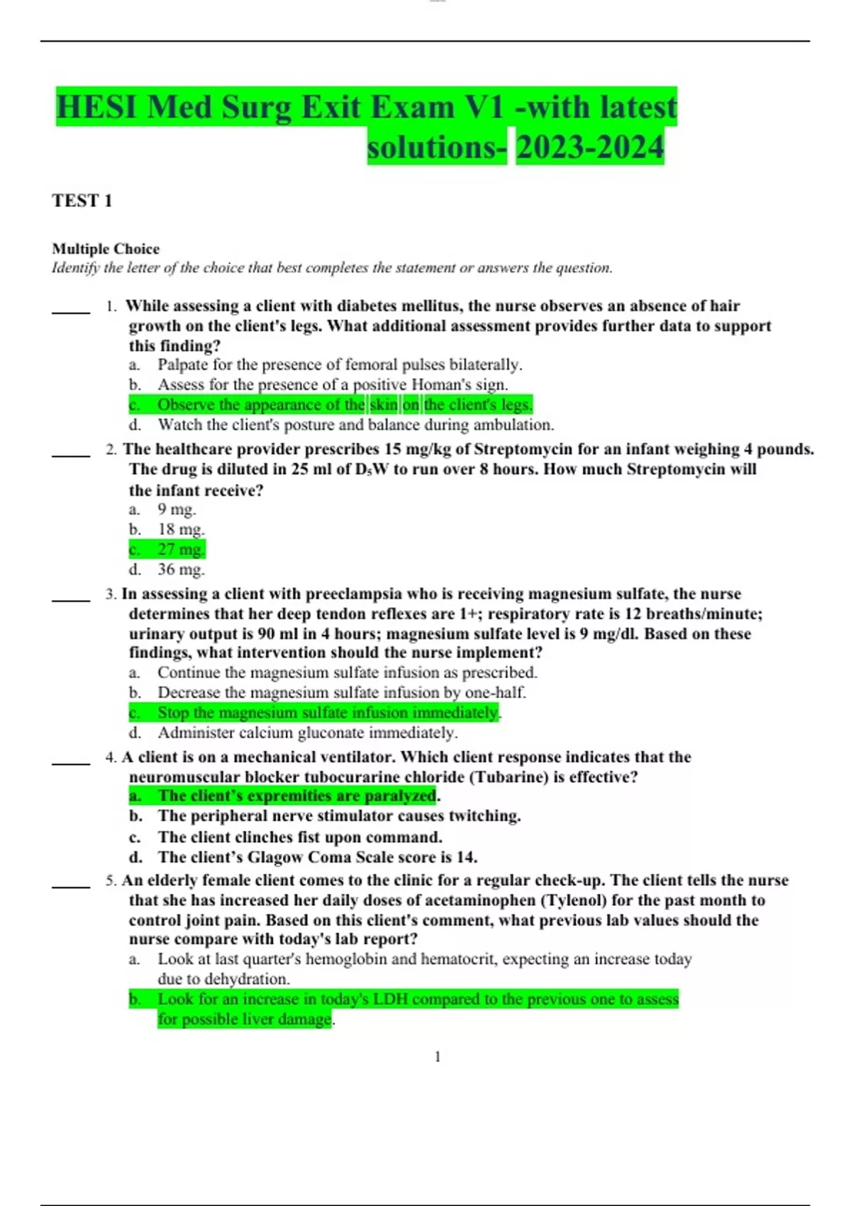 HESI Med Surg Exit Exam V1 -with latest solutions-