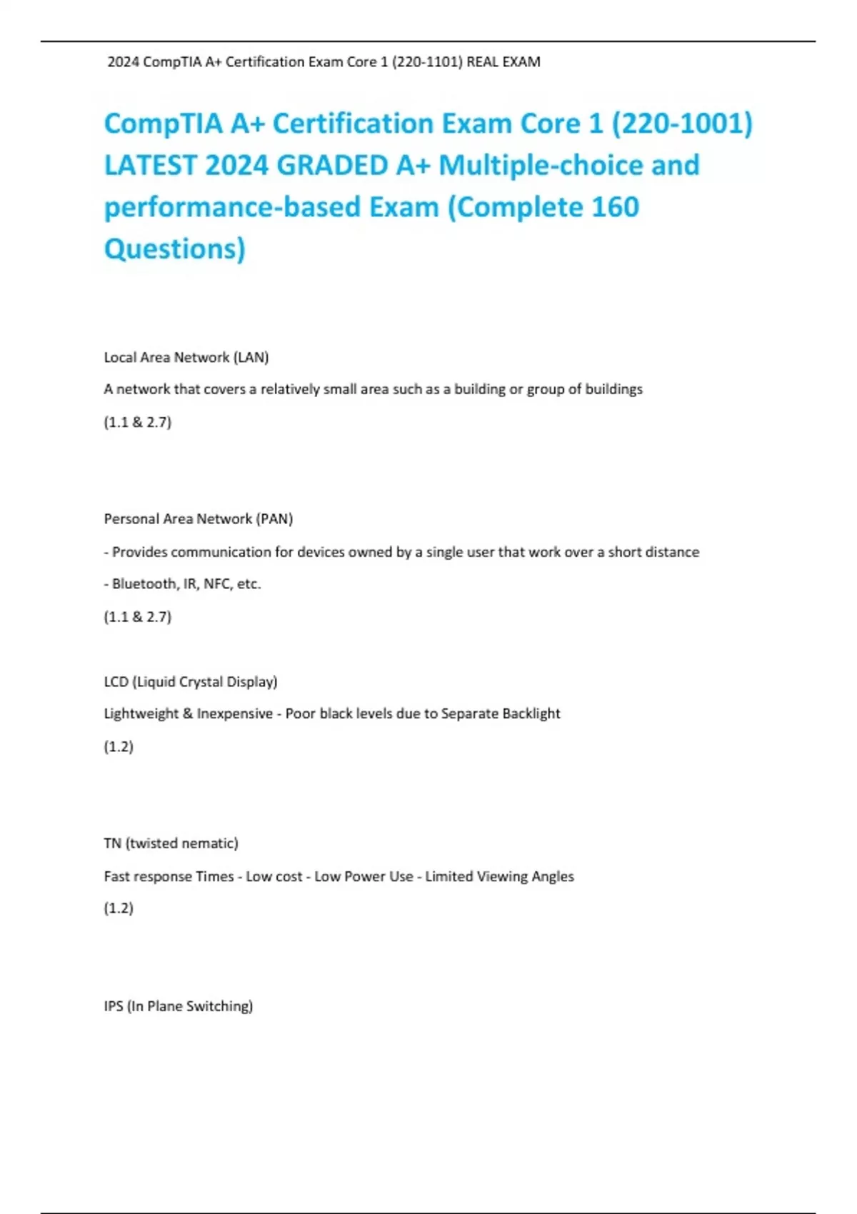 CompTIA A+ Certification Exam Core 1 (220-1101) LATEST 2024 GRADED A+ Multiple-choice and performance-based Exam (Complete 160 Questions)
