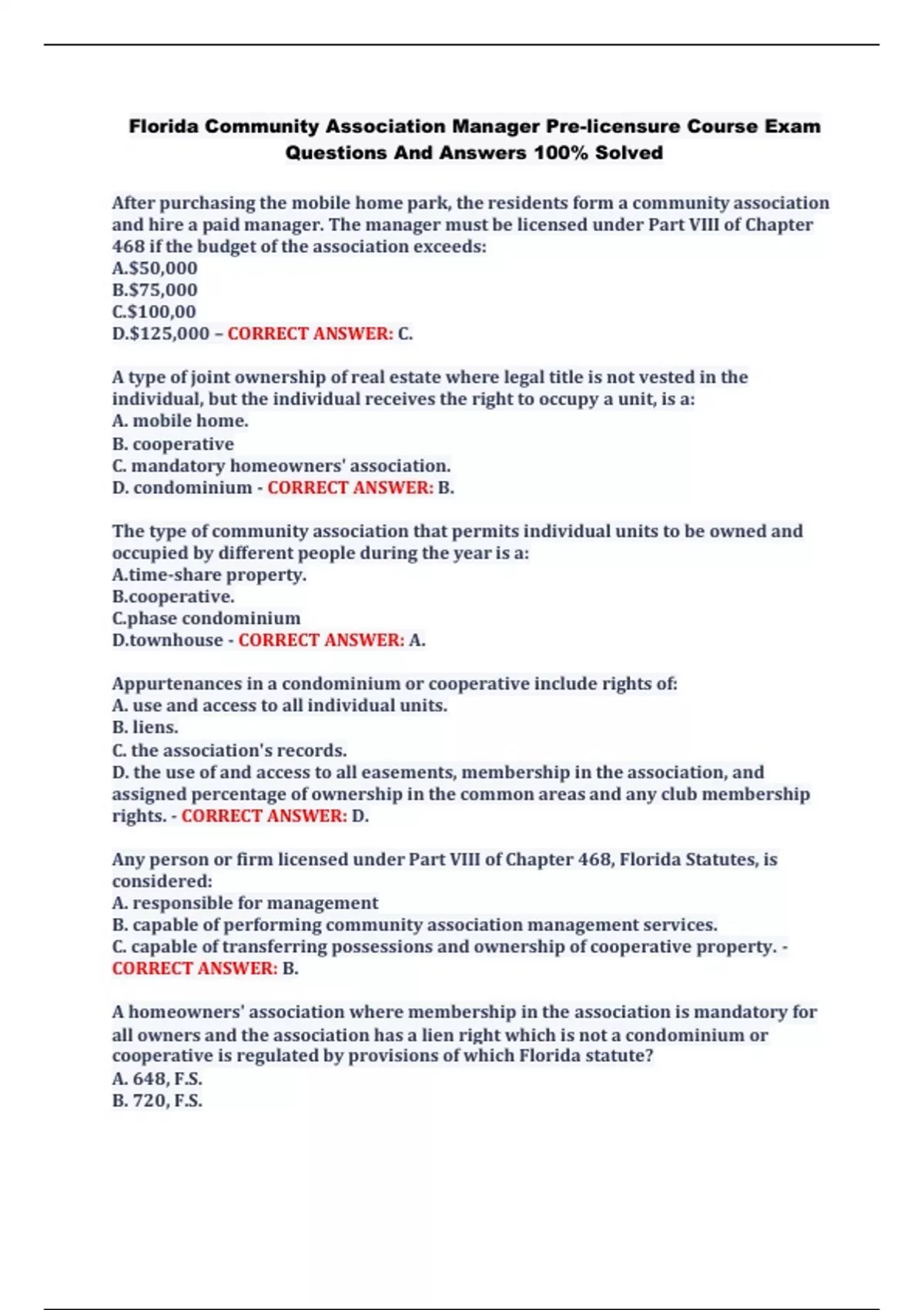 Florida Community Association Manager Pre-licensure Course Exam Questions And Answers 100% Solved