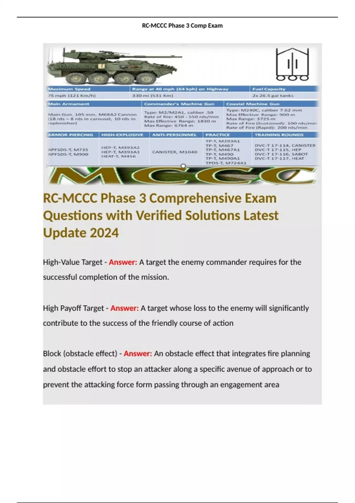 RC-MCCC Phase 3 Comprehensive Exam Questions with Verified Solutions Latest Update 2024 Terms like: High-Value Target - Answer: A target the enemy commander requires for the successful completion of the mission.