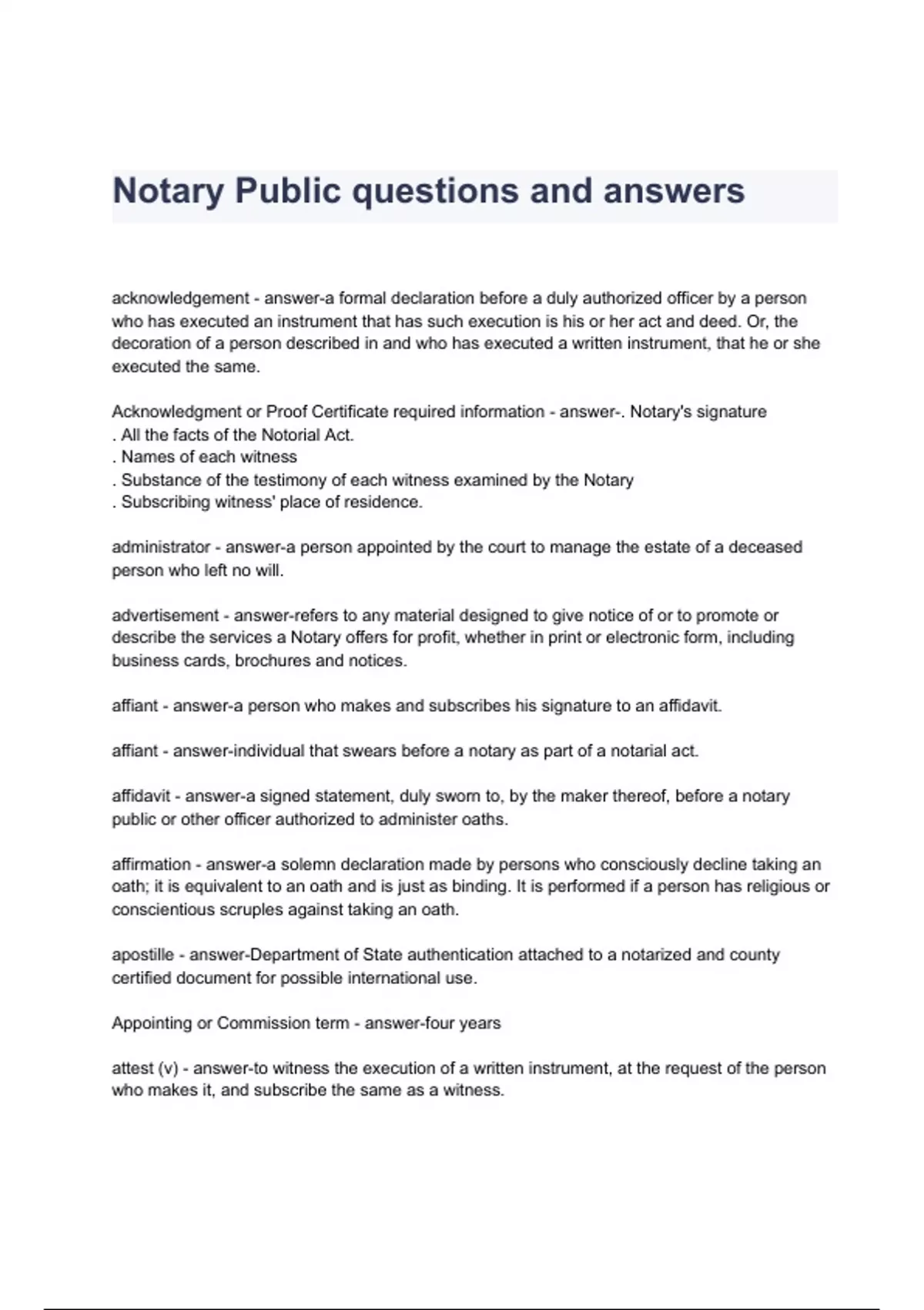 Notary Public questions and answers acknowledgement - answer-a formal declaration before a duly authorized officer by a person who has executed an instrument that has such execution is his or her act and deed. Or, the decoration of a person described in and who has executed a written instrument, that he or she executed the same. Acknowledgment or Proof Certificate required information - answer-. Notary's signature . All the facts of the Notorial Act. . Names of each witness . Substance of the testimony of each witness examined by the Notary . Subscribing witness' place of residence. administrator - answer-a person appointed by the court to manage the estate of a deceased person who left no will. advertisement - answer-refers to