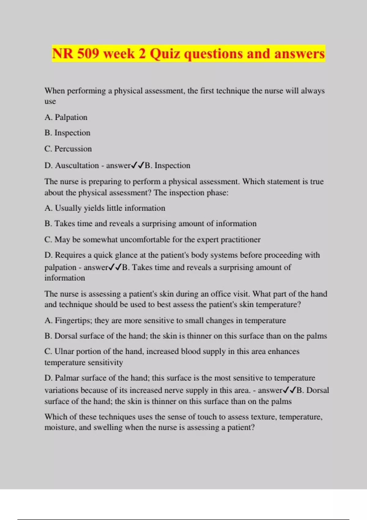 NR 509 week 2 Quiz questions and answers When performing a physical assessment, the first technique the nurse will always use A. Palpation B. Inspection C. Percussion D. Auscultation - answerB. Inspection The nurse is preparing to perform a physical assessment. Which statement is true about the physical assessment? The inspection phase: A. Usually yields little information B. Takes time and reveals a surprising amount of information C. May be somewhat uncomfortable for the expert practitioner D. Requires a quick glance at the patient's body systems before proceeding with palpation - answerB. Takes time and reveals a surprising amount of information The nurse is assessing a patient's skin during an office visit. What part of the hand and technique should be used to best assess the patient's skin temperature? A. Fingertips; they are more sensitive to small changes in temperature B. Dorsal surface of the hand; the skin is thinner on this surface than on the palms C. Ulnar portion of the hand, increased blood supply in this area enhances temperature sensitivity D. Palmar surface of the hand; this surface is the most sensitive to temperature variations because of its increased nerve supply in this area. - answerB. Dorsal surface of the hand; the skin is thinner on this surface than on the palms Which of these techniques uses the sense of touch to assess texture, temperature, moisture, and swelling when the nurse is assessing a patient? A. Palpation B. Inspection C. Percussion D. Auscultation - answerA. Palpation The nurse is preparing to assess a patient's abdomen by palpation. How should the nurse proceed? A. Palpation of reportedly tender areas are avoided because palpation in these areas may cause pain B. Palpating a tender area is quickly performed to avoid any discomfort that the patient may experience C. The assessment begins with deep palpation, while encouraging the patient to relax and to take deep breaths. D. The assessment begins with light palpation to detect surface characteristics and to accustom the patient to being touched. - answerD. The assessment begins with light palpation to detect surface characteristics and to accustom the patient to being touched. The nurse would use bimanual palpation technique in which situation? A. Palpating the thorax of an infant B. Palpating the kidneys and the uterus C. Assessing pulsations and vibrations D. Assessing the presence of tenderness and pain - answerB. Palpating the kidneys and the uterus The nurse is preparing to percuss the abdomen of a patient. The purpose of the percussion is to assess the ___________ of the underlying tissue. A. Turgor B. Texture C. Density D. Consistency - answerC. Densit