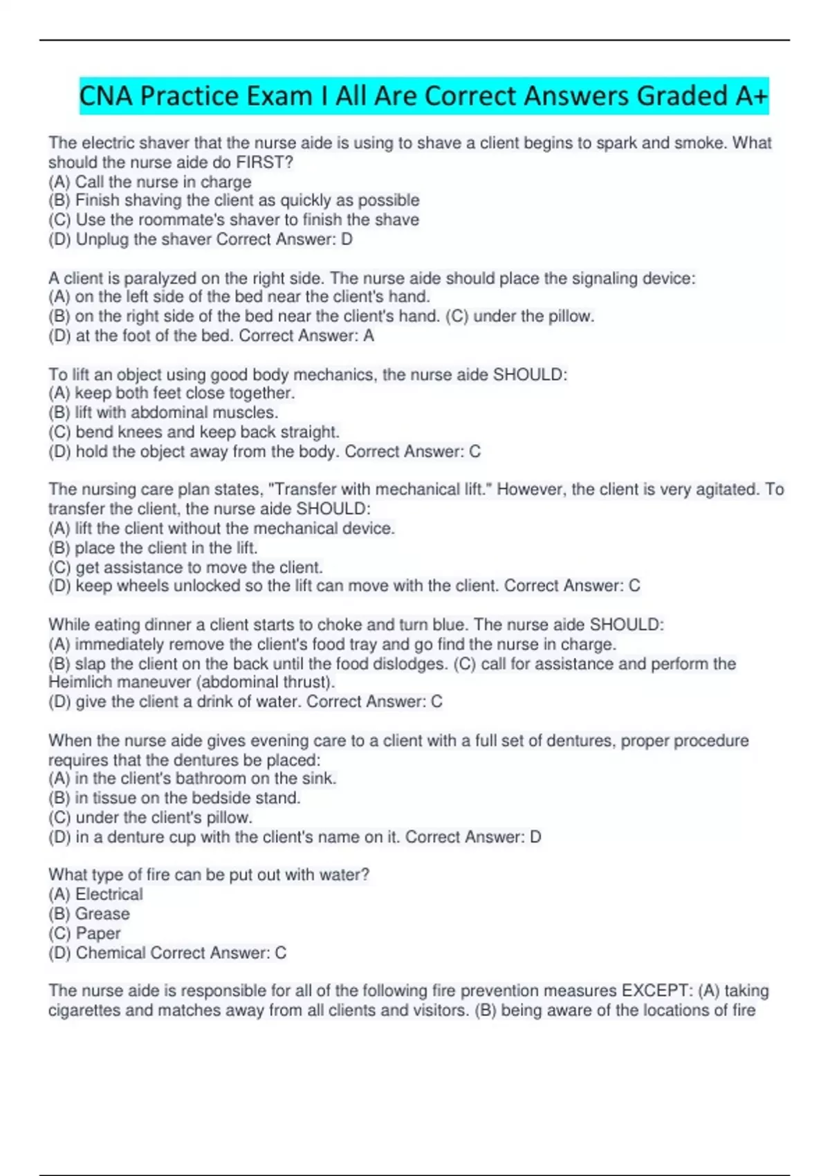 The electric shaver that the nurse aide is using to shave a client begins to spark and smoke. What should the nurse aide do FIRST? (A) Call the nurse in charge (B) Finish shaving the client as quickly as possible (C) Use the roommate's shaver to finish the shave (D) Unplug the shaver Correct Answer: D A client is paralyzed on the right side. The nurse aide should place the signaling device: (A) on the left side of the bed near the client's hand. (B) on the right side of the bed near the client's hand. (C) under the pillow. (D) at the foot of the bed. Correct Answer: A To lift an object using good body mechanics, the nurse aide SHOULD: (A) keep both feet close together. (B) lift with abdominal muscles. (C) bend knees and keep back straight. (D) hold the object away from the body. Correct Answer: C The nursing care plan states, "Transfer with mechanical lift." However, the client is very agitated. To transfer the client, the nurse aide SHOULD: (A) lift the client without the mechanical device. (B) place the client in the lift. (C) get assistance to move the client. (D) keep wheels unlocked so the lift can move with the client. Correct Answer: C While eating dinner a client starts to choke and turn blue. The nurse aide SHOULD: (A) immediately remove the client's food tray and go find the nurse in charge. (B) slap the client on the back until the food dislodges. (C) call for assistance and perform the Heimlich maneuver (abdominal thrust). (D) give the client a drink of water. Correct Answer: C
