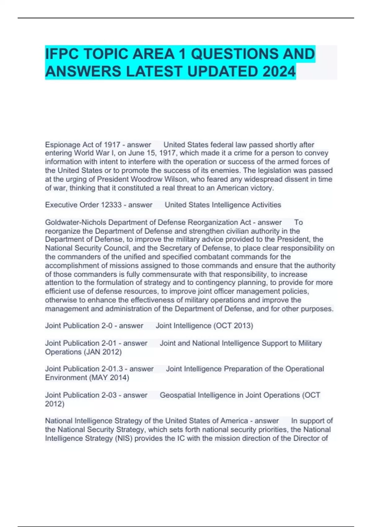 IFPC TOPIC AREA 1 QUESTIONS AND ANSWERS LATEST UPDATED 2024 Espionage Act of 1917 United States federal law passed shortly after entering World War I, on June 15, 1917, which made it a crime for a person to convey information with intent to interfere with the operation or success of the armed forces of the United States or to promote the success of its enemies. The legislation was passed at the urging of President Woodrow Wilson, who feared any widespread dissent in time of war, thinking that it constituted a real threat to an American victory. Executive Order 12333 United States Intelligence Activities Brainpower Read More Previous Play Next Rewind 10 seconds Move forward 10 seconds Unmute 0:02 / 0:15 Full screen Goldwater-Nichols Department of Defense Reorganization Act To reorganize the Department of Defense and strengthen civilian authority in the Department of Defense, to improve the military advice provided to the President, the National Security Council, and the Secretary of Defense, to place clear responsibility on the commanders of the unified and specified combatant commands for the accomplishment of missions assigned to those commands and ensure that the authority of those commanders is fully commensurate with that responsibility, to increase attention to the formulation of strategy and to contingency planning, to provide for more efficient use of defense resources, to improve joint officer management policies, otherwise to enhance the effectiveness of military operations and improve the management and administration of the Department of Defense, and for other purposes. Joint Publication 2-0 Joint Intelligence (OCT 2013) Joint Publication 2-01 Joint and National Intelligence Support to Military Operations (JAN 2012) Joint Publication 2-01.3 Joint Intelligence Preparation of the Operational Environment (MAY 2014) Joint Publication 2-03 Geospatial Intelligence in Joint Operations (OCT 2012) National Intelligence Strategy of the United States of America In support of the National Security Strategy, which sets forth national security priorities, the National Intelligence Strategy (NIS) provides the IC with the mission direction of the Director of National Intelligence (DNI) for the next four to five years. IC activities must be consistent with, and responsive to, national security priorities and must comply with the Constitution, applicable statutes, and Congressional oversight requirements. The NIS should be read along with the National Intelligence Priorities Framework and Unifying Intelligence Strategies to inform and guide mission, as well as planning, programming, and budgeting activities.