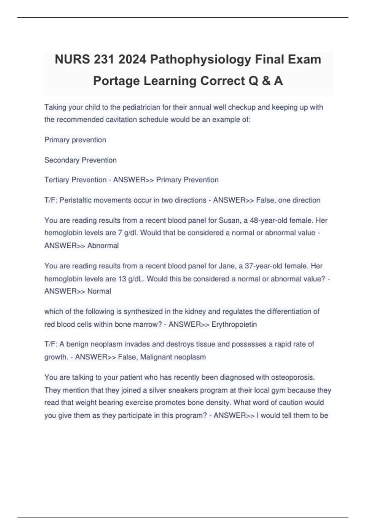 NURS 231 2024 Pathophysiology Final Exam Portage Learning Correct Q & A