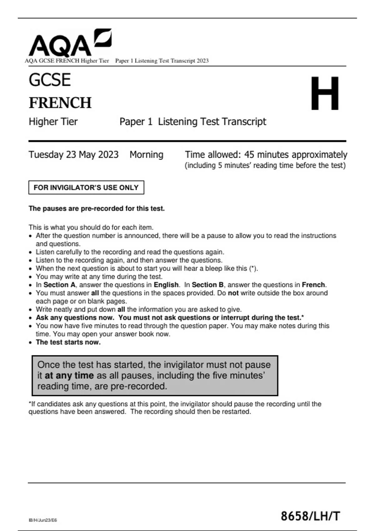 AQA GCSE FRENCH Higher Tier Paper 1 Listening Test Transcript 2023