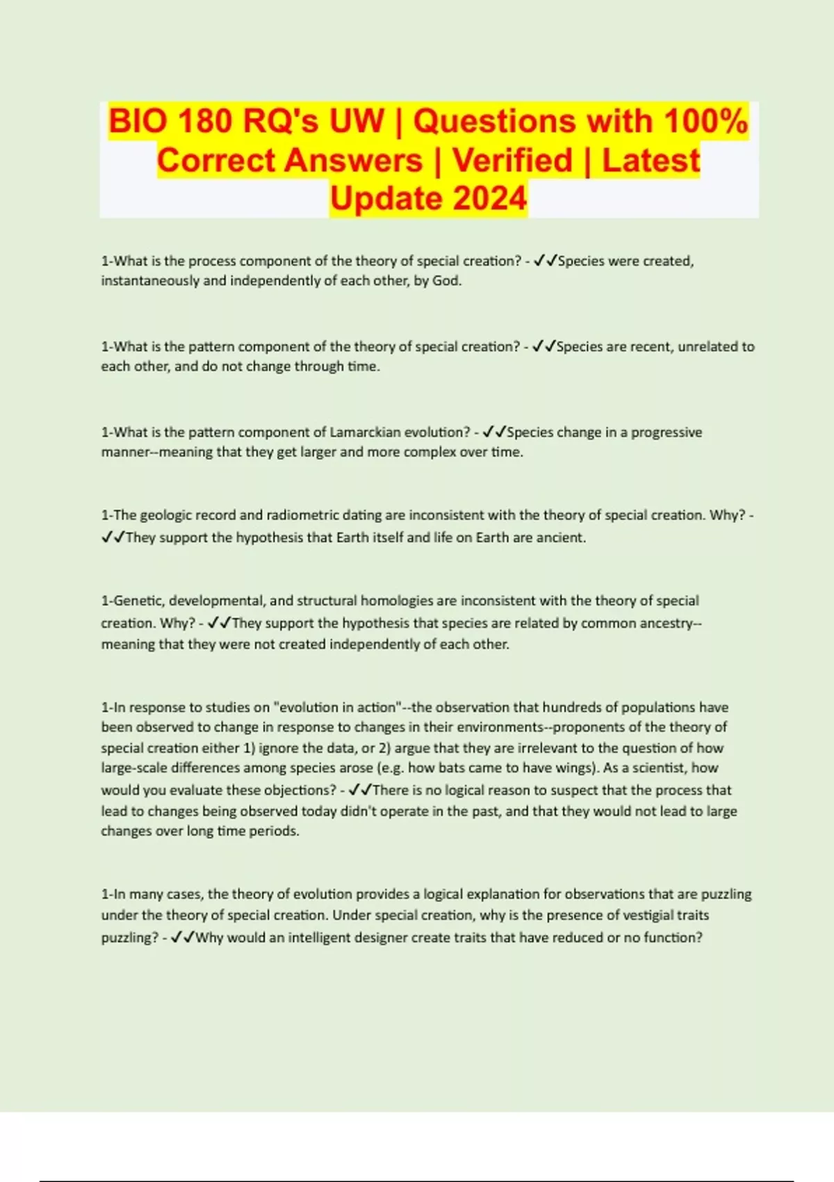 BIO 180 RQ's UW | Questions with 100% Correct Answers | Verified | Latest Update 2024