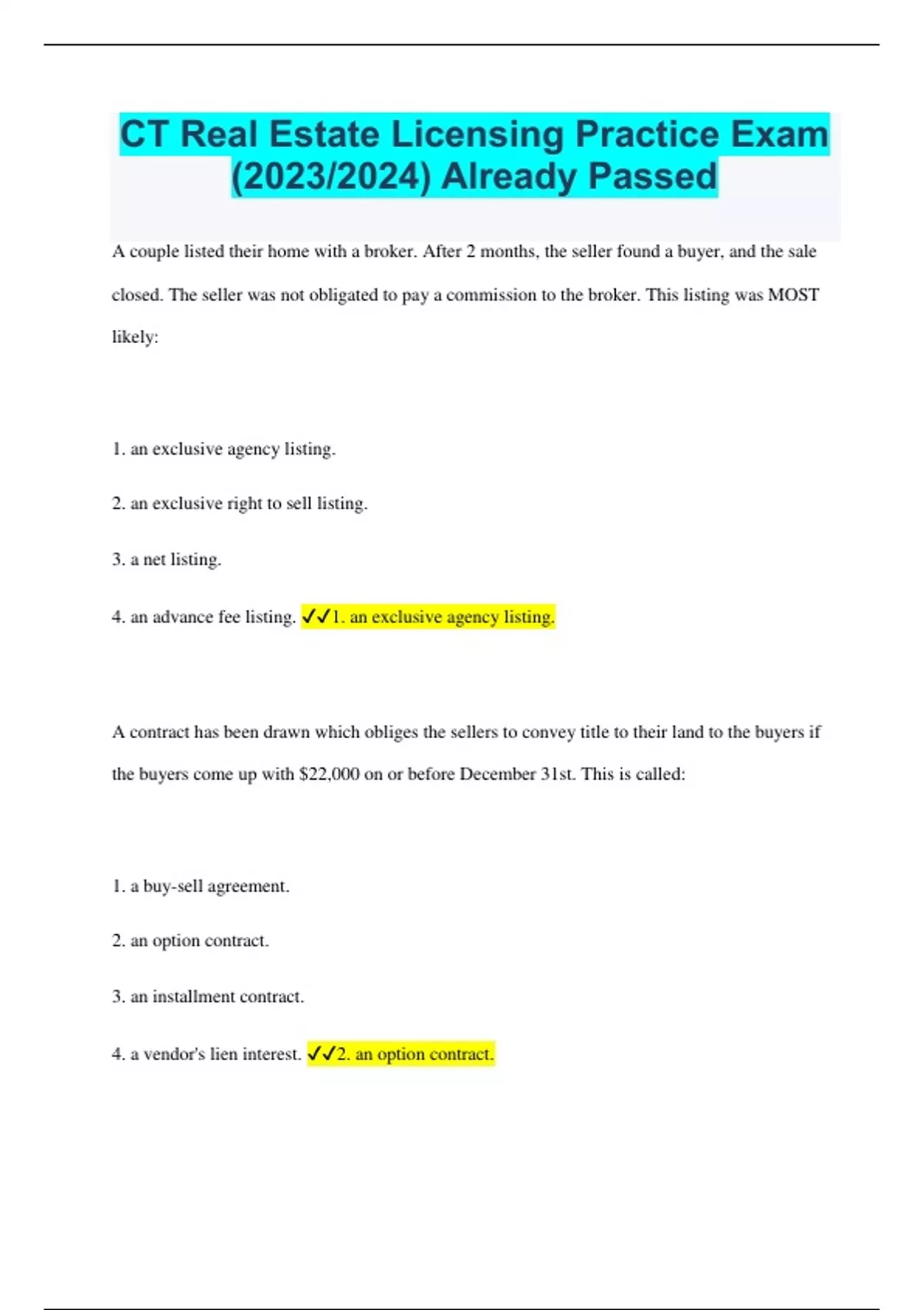 CT Real Estate Licensing Practice Exam (2023/2024) Already Passed