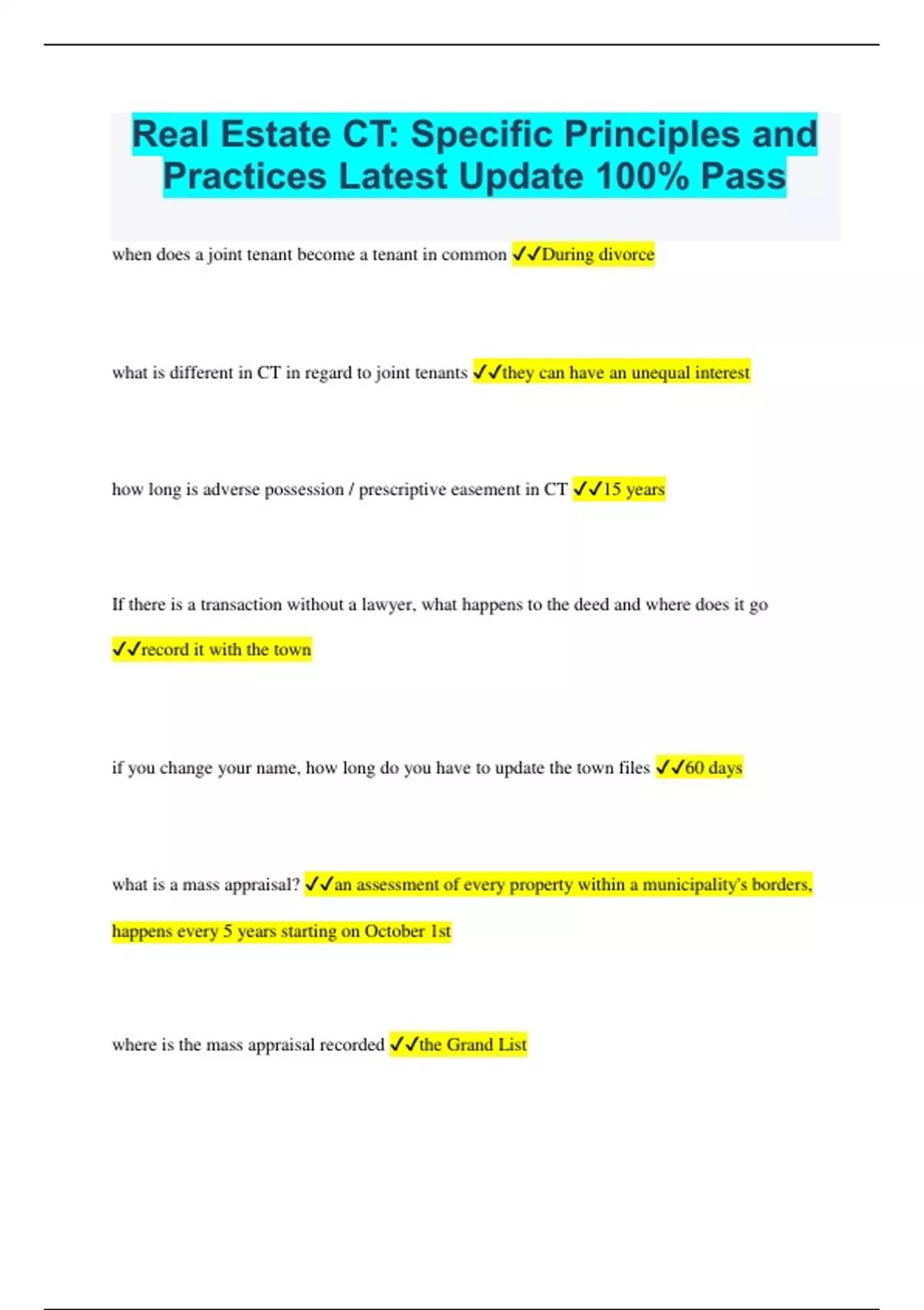 Real Estate CT: Specific Principles and Practices Latest Update 100% Pass when does a joint tenant become a tenant in common During divorce what is different in CT in regard to joint tenants they can have an unequal interest how long is adverse possession / prescriptive easement in CT 15 years If there is a transaction without a lawyer, what happens to the deed and where does it go record it with the town if you change your name, how long do you have to update the town files 60 days what is a mass appraisal? an assessment of every property within a municipality's borders, happens every 5 years starting on October 1st where is the mass appraisal recorded the Grand List what conditions happen when there is an annual adjustment 1. must continue with annual adjustments for that 5 year cycle 2. annual adjustment capped at 5 percent 3. can be made to specific geographic areas 4. no mailing of a written notice of assessment increase conveyance tax tax imposed for the transfer of real property on seller conveyance tax rate (residential) .75% goes to state .25% goes to municipality conveyance tax rate (commercial) 1.25% goes to state .25% goes to municipality exception to conveyance tax property is worth less than $2000 conveyance tax rate for properties worth over $800,000 1.25% for the portion over $800,000 .75% for the rest The Uniform Property Condition Disclosure Act requires the seller to provide the buyer with... Residential Property Condition Disclosure Report prior to any execution of sale and it must be signed by both parties If the Residential Property Condition Disclosure Report is not given, what is the fine? $500 What is described in the Residential Property Condition Disclosure Report basic system like heat and water who fills out the Residential Property Condition Disclosure Report the seller. NOT the seller's agent what are the exceptions to giving out the Residential Property Condition Disclosure Report 1. Divorce 2. Foreclosure 3. co-owner to co-owner 4. newly constructed residential property property acquired by judgment What does the CT Landlord and Tenant Act cover everything but commercial, medical, educational, fraternal, hotels, motels. what is the exception to hotels and motels for the CT Landlord and Tenant Act its the main home of the occupant or occupancy has been more that 30 days Can you evict someone without court order NO
