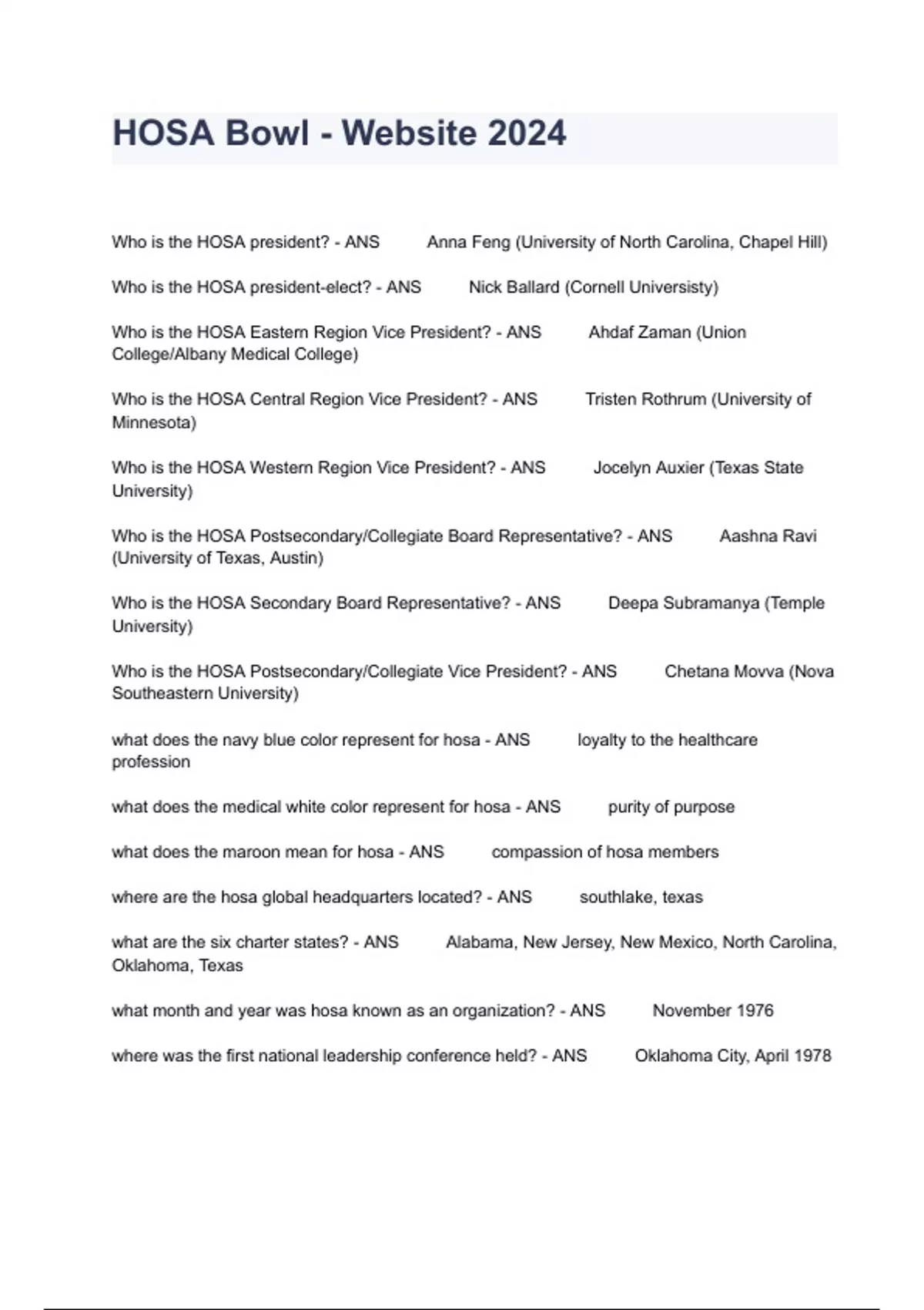 HOSA Bowl - Website 2024 Who is the HOSA president? - ANS Anna Feng (University of North Carolina, Chapel Hill) Who is the HOSA president-elect? - ANS Nick Ballard (Cornell Universisty) Who is the HOSA Eastern Region Vice President? - ANS Ahdaf Zaman (Union College/Albany Medical College) Who is the HOSA Central Region Vice President? - ANS Tristen Rothrum (University of Minnesota) Who is the HOSA Western Region Vice President? - ANS Jocelyn Auxier (Texas State University) Who is the HOSA Postsecondary/Collegiate Board Representative? - ANS Aashna Ravi (University of Texas, Austin) Who is the HOSA Secondary Board Representative? - ANS Deepa Subramanya (Temple University) Who is the HOSA Postsecondary/Collegiate Vice President? - ANS Chetana Movva (Nova Southeastern University) what does the navy blue color represent for hosa - ANS loyalty to the healthcare profession what does the medical white color represent for hosa - ANS purity of purpose what does the maroon mean for hosa - ANS compassion of hosa members where are the hosa global headquarters located? - ANS southlake, texas what are the six charter states? - ANS Alabama, New Jersey, New Mexico, North Carolina, Oklahoma, Texas what month and year was hosa known as an organization? - ANS November 1976 where was the first national leadership conference held? - ANS Oklahoma City, April 1978 what is the theme for the 2024 International Leadership Conference? - ANS "Dare to Create" what is the number of people that can be recognized per chapter for the Barbra James Service Award? - ANS one person/chapter how many people per chapter can run for state HOSA office - ANS one candidate/chapter what are the categories of competitive events? - ANS health science, health professions, teamwork, recognition, middle school, leadership, emergency preparedness, and national geographic learning academic testing center events what are the 6 MAIN categories of competitive events? - ANS health science, health professions, teamwork, recognition, leadership, emergency preparedness how many chartered associations and how many members does HOSA have since 1976? - ANS 56 associations, and over 260,000 members Who is HOSA's Director of membership? - ANS Jeff Koeninger Who is the Executive Director of HOSA, and how long has he been with HOSA headquarters? - ANS Sarah Walters, since August 2022 List 3 events from Health Sciences Events - ANS Behavioral Health Cultural Diversities & Disparities Dental Terminology Health Informatics Human Growth & Development Medical Law & Ethics Medical Math Medical Reading Medical Spelling Medical Terminology Nutrition Pathophysiology Pharmacology List 3 events from Health Professionals Events - ANS Biotechnology Clinical Laboratory Science Clinical Nursing Clinical Specialty Dental Science Family Medicine Physician Home Health Aide Medical Assisting Nursing Assisting Personal Care Pharmacy Science Phlebotomy Physical Therapy Respiratory Therapy Sports Medicine Veterinary Science List 3 events from Emergency Preparedness Events - ANS CERT Skills CPR/First Aid Emergency Medical Technician Epidemiology Life Support Skills Mental Health Promotion MRC Partnership Public Health List 3 events from Leadership Events - ANS Extemporaneous Writing - Health Policy Health Career Photography Healthy Living Interviewing Skills Job Seeking Skills Organizational Leadership Prepared Speaking Researched Persuasive Writing & Speaking Research Poster Speaking Skills List 3 events form Teamwork Events - ANS Biomedical Debate Community Awareness Creative Problem Solving Forensic Science Health Career Display Health Education HOSA Bowl Medical Innovation Parliamentary Procedure Public Service Announcement List 3 Events form Recognition Events - ANS America's Blood Centers & HOSA Blood Drive American Red Cross Volunteer Service Barbara James Service Award Healthcare Issues Exam Emotional Well-Being Challenge HOSA Happenings HOSA Service Project Outstanding HOSA Achievement Outstanding HOSA Alumni Outstanding HOSA Leader What is the current HOSA motto? - ANS The hands of HOSA mold the health of tomorrow What is the original HOSA motto? - ANS The hands of youth mold the health of tomorrow What does the circle in the HOSA emblem represent? - ANS the continuity of health care What does the triangle in the HOSA emblem represent? - ANS the three aspects of humankind's well‑being, social, physical and mental What do the hands in the original HOSA emblem represent? - ANS the caring of each HOSA member Who submitted the HOSA creed? - ANS South Carolina HOSA In what year was the HOSA creed adopted? - ANS 1980 First ever HOSA president? - ANS Lynne McGee Where was the first HOSA Constitutional Convention held? - ANS The Inn of the Six Flags in Arlington, Texas When is National HOSA Week? - ANS The first full week of November What are HOSA's 4 core values? - ANS Learn, Lead, Serve, Innovate How many community service hours do you need for the Barbara James Service Award - ANS 100+ What foreign countries are part of HOSA - ANS American Samoa, Canada, Mexico, Korea, China, and Puerto Rico What is the title of Article I of the HOSA Bylaws? - ANS Name What is the title of Article II of the HOSA Bylaws? - ANS Purpose What is the title of Article III of the HOSA Bylaws? - ANS Membership What is the title of Article IV of the HOSA Bylaws? - ANS Officers What is the title of Article V of the HOSA Bylaws? - ANS Meetings What is the title of Article VI of the HOSA Bylaws? - ANS Executive Council What is the title of Article VII of the HOSA Bylaws? - ANS Parliamentary Authority (Robert's Rules of Order) What is the title of Article VIII of the HOSA Bylaws? - ANS Supervision What is the title of Article IX of the HOSA Bylaws? - ANS Brand and Colors What is the title of Article X of the HOSA Bylaws? - ANS Amendments When was the last time the HOSA bylaws were revised? - ANS June 2023 What are the 5 divisions of HOSA levels? - ANS Middle School, Secondary, Postsecondary/Colleg