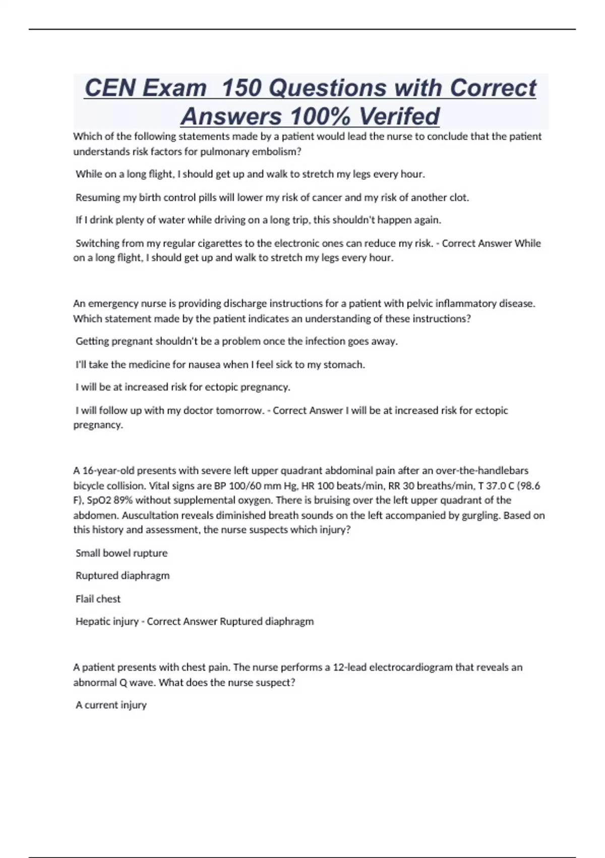 CEN Exam 150 Questions with Correct Answers 100% Verifed Which of the following statements made by a patient would lead the nurse to conclude that the patient understands risk factors for pulmonary embolism? While on a long flight, I should get up and walk to stretch my legs every hour. Resuming my birth control pills will lower my risk of cancer and my risk of another clot. If I drink plenty of water while driving on a long trip, this shouldn't happen again. Switching from my regular cigarettes to the electronic ones can reduce my risk. - Correct Answer While on a long flight, I should get up and walk to stretch my legs every hour. An emergency nurse is providing discharge instructions for a patient with pelvic inflammatory disease. Which statement made by the patient indicates an understanding of these instructions? Getting pregnant shouldn't be a problem once the infection goes away. I'll take the medicine for nausea when I feel sick to my stomach. I will be at increased risk for ectopic pregnancy. I will follow up with my doctor tomorrow. - Correct Answer I will be at increased risk for ectopic pregnancy. A 16-year-old presents with severe left upper quadrant abdominal pain after an over-the-handlebars bicycle collision. Vital signs are BP 100/60 mm Hg, HR 100 beats/min, RR 30 breaths/min, T 37.0 C (98.6 F), SpO2 89% without supplemental oxygen. There is bruising over the left upper quadrant of the abdomen. Auscultation reveals diminished breath sounds on the left accompanied by gurgling. Based on this history and assessment, the nurse suspects which injury? Small bowel rupture Ruptured diaphragm Flail chest Hepatic injury - Correct Answer Ruptured diaphragm A patient presents with chest pain. The nurse performs a 12-lead electrocardiogram that reveals an abnormal Q wave. What does the nurse suspect? A current injury