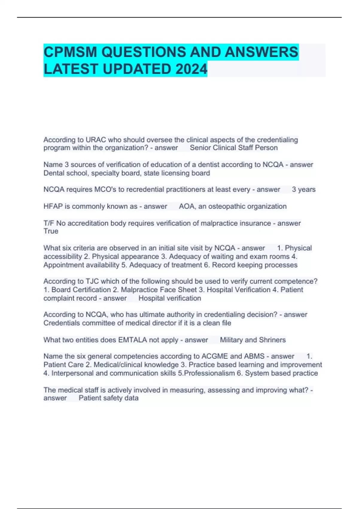 CPMSM QUESTIONS AND ANSWERS LATEST UPDATED 2024 According to URAC who should oversee the clinical aspects of the credentialing program within the organization? Senior Clinical Staff Person Name 3 sources of verification of education of a dentist according to NCQA Dental school, specialty board, state licensing board Brainpower Read More Previous Play Next Rewind 10 seconds Move forward 10 seconds Unmute 0:06 / 0:15 Full screen NCQA requires MCO's to recredential practitioners at least every 3 years HFAP is commonly known as AOA, an osteopathic organization T/F No accreditation body requires verification of malpractice insurance True What six criteria are observed in an initial site visit by NCQA 1. Physical accessibility 2. Physical appearance 3. Adequacy of waiting and exam rooms 4. Appointment availability 5. Adequacy of treatment 6. Record keeping processes According to TJC which of the following should be used to verify current competence? 1. Board Certification 2. Malpractice Face Sheet 3. Hospital Verification 4. Patient complaint record Hospital verification According to NCQA, who has ultimate authority in credentialing decision? Credentials committee of medical director if it is a clean file What two entities does EMTALA not apply Military and Shriners Name the six general competencies according to ACGME and ABMS 1. Patient Care 2. Medical/clinical knowledge 3. Practice based learning and improvement 4. Interpersonal and communication skills 5.Professionalism 6. System based practice The medical staff is actively involved in measuring, assessing and improving what? Patient safety data If a hospital loses accreditation for providing falsified information to the joint commission, it may not participate in the accreditation process again for a period of how long? 1 year What does the NCQA use for public reporting of survey results? Health Plan Report Card Areas of an organization's system, structure and process that are most relevant to the organization's patient safety & quality of care, AND most at rick for negative outcomes are referred to as what according to the Joint Commission? Critical focus areas According to NCQA what must be included in the organizations rights to appeal policies? Written notification of the action including the reasons for the action If a CVO wishes to request reconsideration of denial of its certification it must do so within how many days? 30 days An MCO may appeal the accreditation decision by NCQA within how many days 30 days T/F Negligence is considered a standard of care violation True If a hospital changes ownership/control/change in capacity, it must notify TJC in writing not less than how many days after he change? 30 days Cancer Registry programs may be accredited for up to 3 years In order for an organization to apply for NCQA survey, they must have been in operation for how long? 18 months In order to apply for NCQA certification the CVO must have been under contract to provide verification services at least Six months According to URAC's health network standards, each applicant within the scope of the credentialing program submits an application that includes at least.... State licensure information, including current license(s) and history of licensure in all jurisdiction According to The Joint Commission hospital standards, _________________________________ is an element of a self-governing medical staff The medical staff determines the mechanism for establishing and enforcing criteria for assigning oversight responsibilities to practitioners with independent privileges.