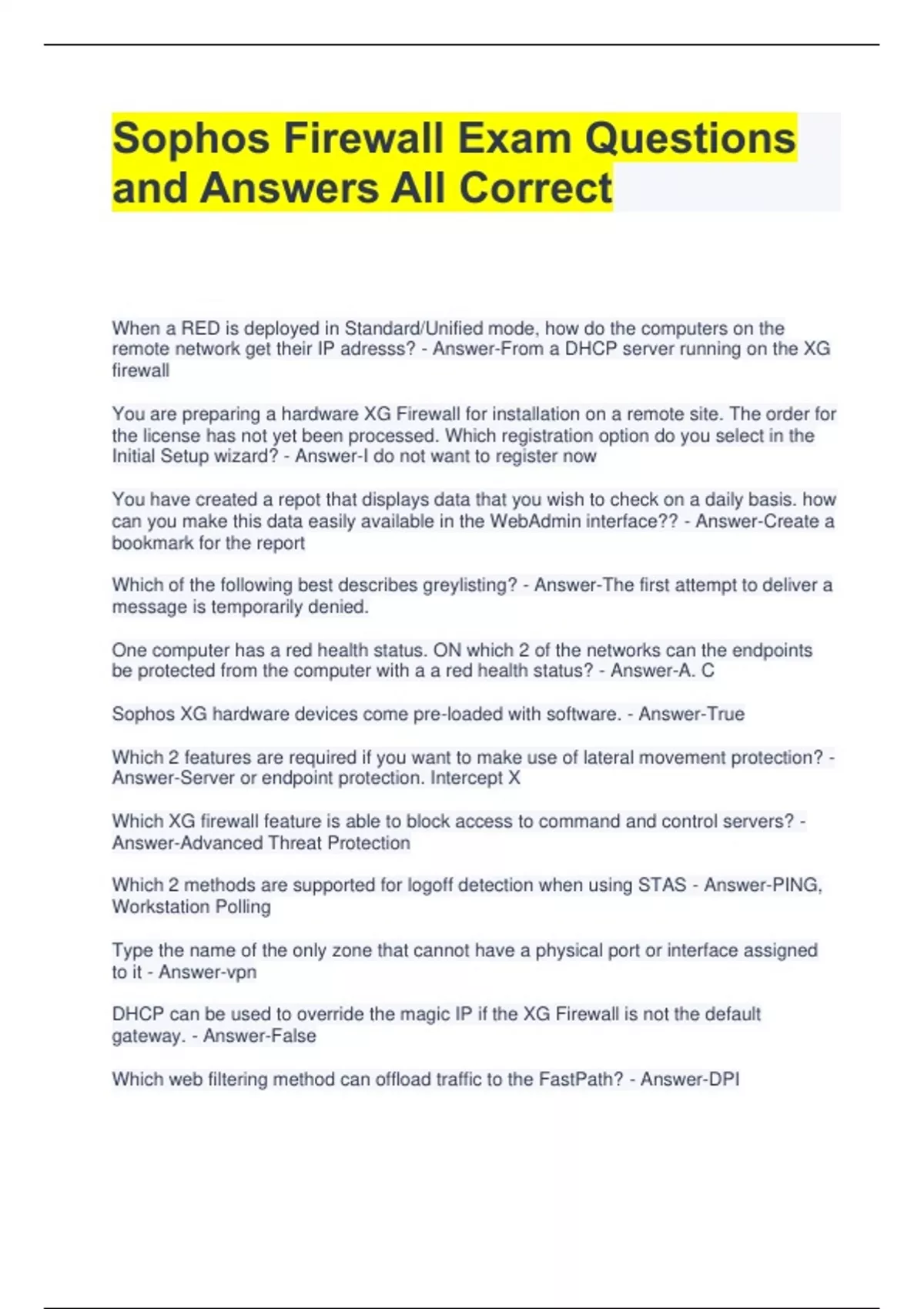 Sophos Firewall Exam Questions and Answers All Correct When a RED is deployed in Standard/Unified mode, how do the computers on the remote network get their IP adresss? - Answer-From a DHCP server running on the XG firewall You are preparing a hardware XG Firewall for installation on a remote site. The order for the license has not yet been processed. Which registration option do you select in the Initial Setup wizard? - Answer-I do not want to register now You have created a repot that displays data that you wish to check on a daily basis. how can you make this data easily available in the WebAdmin interface?? - Answer-Create a bookmark for the report Which of the following best describes greylisting? - Answer-The first attempt to deliver a message is temporarily denied. One computer has a red health status. ON which 2 of the networks can the endpoints be protected from the computer with a a red health status? - Answer-A. C Sophos XG hardware devices come pre-loaded with software. - Answer-True Which 2 features are required if you want to make use of lateral movement protection? - Answer-Server or endpoint protection. Intercept X Which XG firewall feature is able to block access to command and control servers? - Answer-Advanced Threat Protection Which 2 methods are supported for logoff detection when using STAS - Answer-PING, Workstation Polling